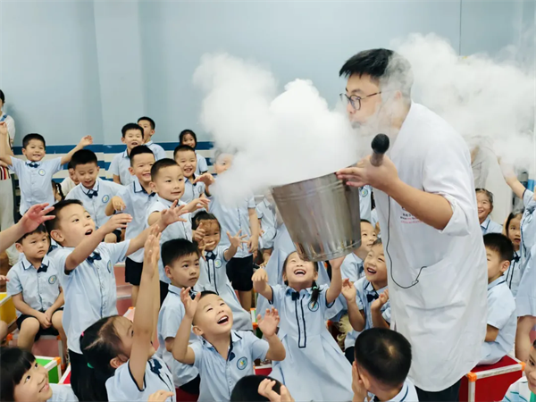 海棠园也将科学游戏融入其中。当孩子遇上科学,世界变得奇妙;当科学成为游戏,成长变得有趣。干冰泡泡、恐龙打喷嚏、空气炮、液氮大爆炸……一场又一场充满科幻色彩和互动性的游戏让孩子们体验到科学的神奇和有趣。欢乐带动跳点燃了现场,每一个老师、孩子、家长的脸上都洋溢着快乐的笑容,一起向新学期出发。
