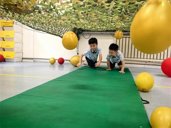 淮河路园将游戏贯穿始终,孩子们欢快的自选游戏。在“越过沼泽地”游戏中,孩子们脚踏砖块稳步前行,口号“脚踩砖头不落水”诠释沉着;“穿越火线”游戏中孩子们灵巧穿越,彰显纪律;“炮击手”与“运送炸药包”游戏中,孩子们精准射击、协作运物资,呼应“目标坚定”“团队协作”精神,游戏场化身革命精神实践基地。在游戏中为每一位幼儿埋下了红色种子,也让不畏艰难、团结互助的品格伴随每一位宝贝的终身成长!