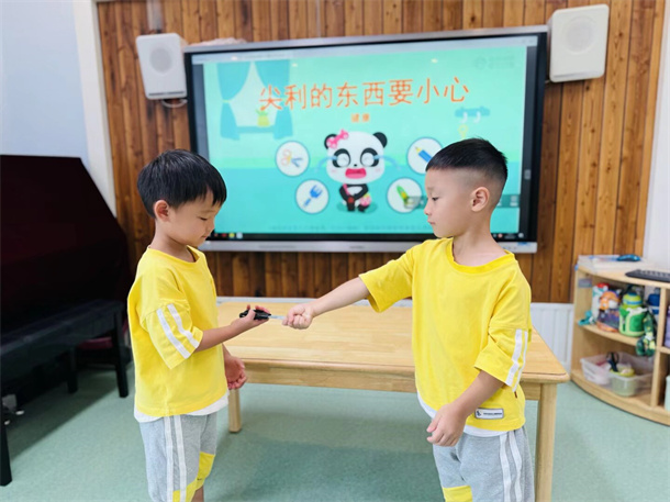 老师们利用图片引导幼儿正确判断生活中的安全行为,孩子们共同学习《交通安全歌》、《上下楼梯安全歌》、《尖利东西要小心》等朗朗上口的儿歌,在游戏、儿歌等趣味互动中了解各类安全知识。