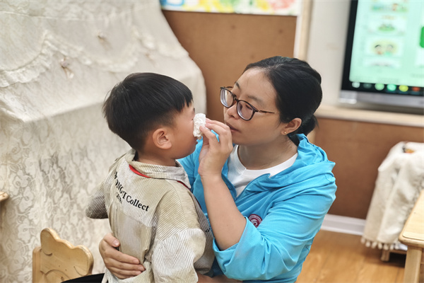 离开熟悉的家进入幼儿园的集体生活,是宝贝们的第一次“小冒险”,也是融入集体生活的第一步,当宝贝们哭着说“我要妈妈”的时候,老师会轻轻把他们抱进怀里,用温柔的的声音耐心的安抚着宝贝们的情绪。