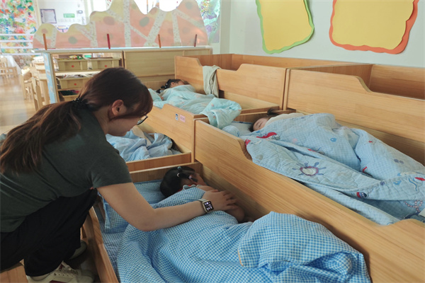 午睡时,教室静悄悄的。宝贝们躺在小床上,盖着自己小被子,进入了梦乡。老师们轻轻的巡视着睡房,帮踢被子的宝贝掖好被角,偶尔会有宝贝醒来,也会在老师们的轻声安抚中缓缓入睡。