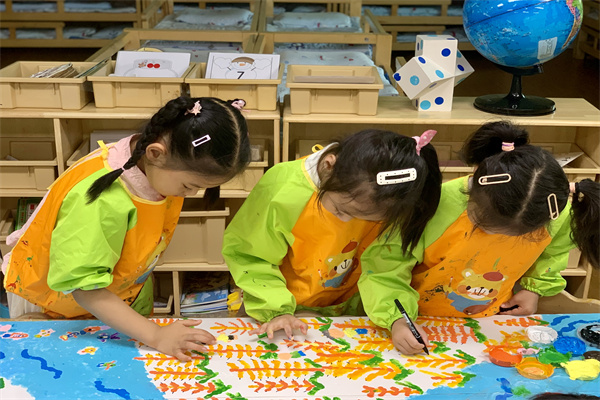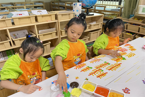 创作环节是孩子们大展身手的时刻!他们化身小小“点彩大师”,用小手指代替画笔,以点为笔,以色为墨,全身心地投入集体创作的海洋。孩子们选用了灿烂的金黄、饱满的橘色,一点点、一层层,细心点缀出阳光下随风起伏的滚滚麦浪,画面充满了温暖的丰收气息。
