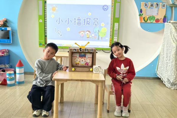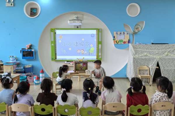 中班的宝贝们以“分享与表达”为重点,让普通话成为交流的“快乐纽带”。幼儿参与“推普倡议书”共创,将“说好普通话,朋友遍天下”等小知识画进倡议里,传递推普小理念。 每日晨间,幼儿便会开启“普通话小喇叭”播报,分享自己喜欢的图书以及有趣的小事情;在午餐前,“小小播报员”更成了班级“小明星”,几名幼儿轮流用普通话介绍“今天吃自助餐”“明天会下雨要带伞”,还和小伙伴一起通过多媒体用普通话传达精彩的故事情节,在互动中提升语言应用能力。