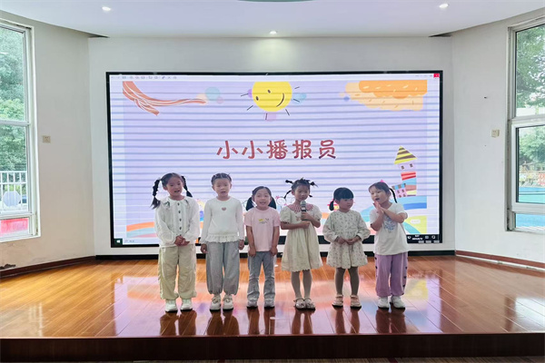 大班:我是小小播报员——自信秀风采 大班组以“我是小小播报员”为主题,培养幼儿的语言组织与展示能力。老师先穿主持服、持话筒示范流程,强调“看着大家眼睛”“声音洪亮”等礼仪;幼儿分组领取“主持串词卡”练习,针对站姿、语气问题,老师用“想象自己是小老师”“说‘大家好’时声音上扬”等方式指导;模拟环节中,幼儿轮流主持。