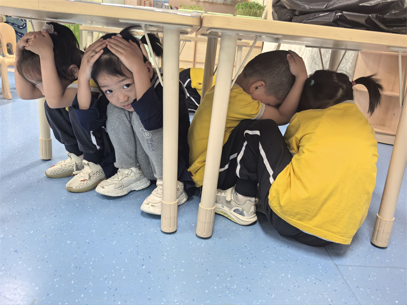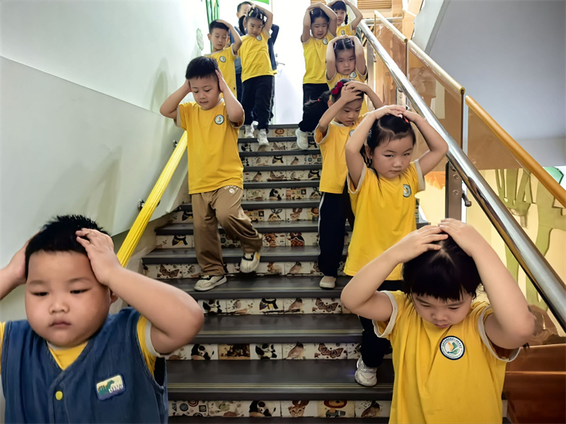 随着防空警报声再次响起,各班级教师迅速行动,按照预定疏散路线,引导幼儿用双手护头、弯腰低姿,快速且有序地撤离活动室。过程中,教师时刻关注幼儿安全,提醒幼儿不推挤、不慌乱,短短几分钟内,全体师幼便安全疏散至园区操场指定安全区域。