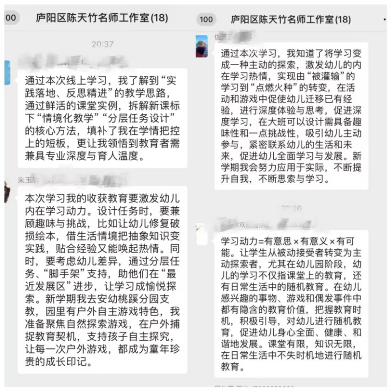 未来,在陈天竹名师工作室专业的引领下,成员间将秉持“互学互鉴、共生共长”的理念,以优质资源为基石,以能力提升为核心,分享实践经验、探讨工作难题、共探教育创新路径,形成协同发展的良好生态,共同为庐阳学前教育事业的高质量发展注入新活力、贡献新力量。 |
