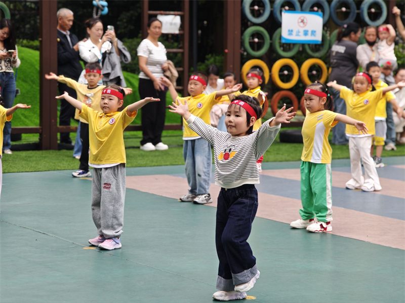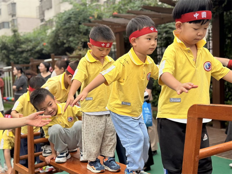 游戏传承红色 为传承红色基因,结合国庆主题,幼儿园将户外游戏设计为 “小小兵从军记” 特色活动。看,孩子们头上戴着发带,脸颊上贴着闪亮的国旗贴纸,瞬间化身英姿飒爽的 “小小兵”,眼神中满是自豪与期待。 小班的 “小小红军” 们勇敢挑战 “长征初体验”,手脚并用地爬上草坡、小心翼翼地穿过索道、稳稳地走过石子路,每完成一个关卡,都会转头向身后的家长露出胜利的微笑;中大班的孩子们则开启了 “长征体能大循环”,在平衡木上稳步前行、攀爬架上灵活穿梭、跨过高低错落的障碍,在一次次尝试中锻炼了平衡、攀爬、跨越等多项体能技能,更在模拟长征的过程中,悄悄将勇敢坚毅的品质种进了心里。