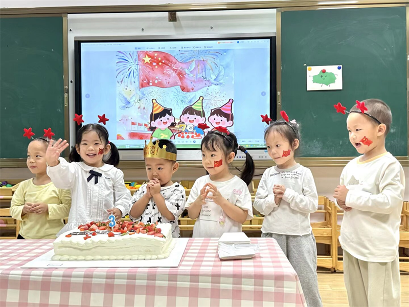 与祖国妈妈共庆生 活动的最后,幼儿园为孩子们准备了香甜的生日蛋糕。当印有“祝祖国妈妈生日快乐”的蛋糕被推上台时,孩子们不约而同地说起“祖国妈妈生日快乐”,稚嫩的声音饱含着对祖国的热爱;同时,还一起唱响《生日快乐歌》一起为十月份过生日的小朋友送上祝福。孩子们与祖国妈妈一起过生日一同分享美味的蛋糕,甜香在口中弥漫,幸福在心中流淌,大家共同为祖国妈妈送上最真挚的生日祝福。