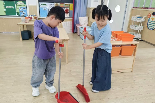 在日常培养中,幼儿生活能力与运动素养提升是重点关注方向。其中,“打扫卫生我最棒”主题通过家园共育鼓励幼儿参与家务,同时结合班级“我是值日生”活动,助力幼儿养成劳动习惯、增强责任意识;与之相辅相成的“我爱运动”主题,则以户外游戏“好玩的绳子”与健康趣味竞赛为载体,让幼儿在探索与比拼中发展肢体协调性、激发运动热情,切实感受运动魅力。