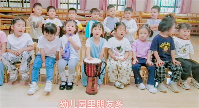 “我爱我的幼儿园,幼儿园里朋友多”伴着欢快的旋律,孩子们跟着老师一同歌唱《我爱我的幼儿园》,用奶声奶气的嗓音表达对幼儿园的喜爱,一张张小脸上洋溢着幸福的笑容。幼儿在快乐的音乐游戏中成长。