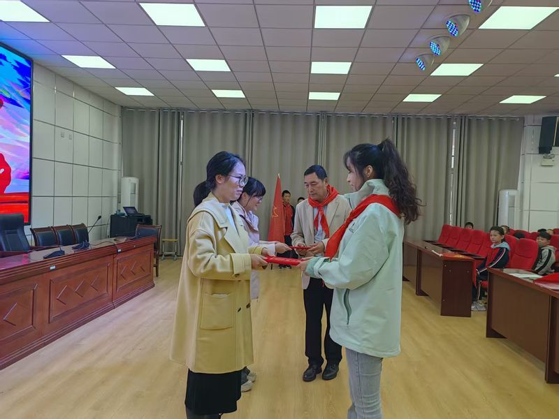 仪式伊始,大队辅导员董老师深情讲述了少先队的光荣历史与红领巾、队旗、队徽的深刻内涵,让全体新队员深刻感受到少先队组织的庄严与使命的神圣。随后,在老少先队员的引领下,新队员们庄严肃立,面向鲜艳的队旗,高举右拳,齐声诵读入队誓词:展现了新时代少先队员坚定的理想信念与成长决心。