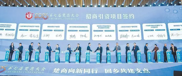 10月29日,第七届楚商大会举行招商引资项目签约活动。(魏铼 摄) 联影集团董事长薛敏等楚商代表在开幕式上发言,省发改委负责人介绍湖北省营商环境及科技创新、人才支撑与产业生态情况,省商务厅负责人介绍精准招商和楚商回乡情况。会上还发布了楚商社会责任标杆企业。18个重点项目进行现场签约。