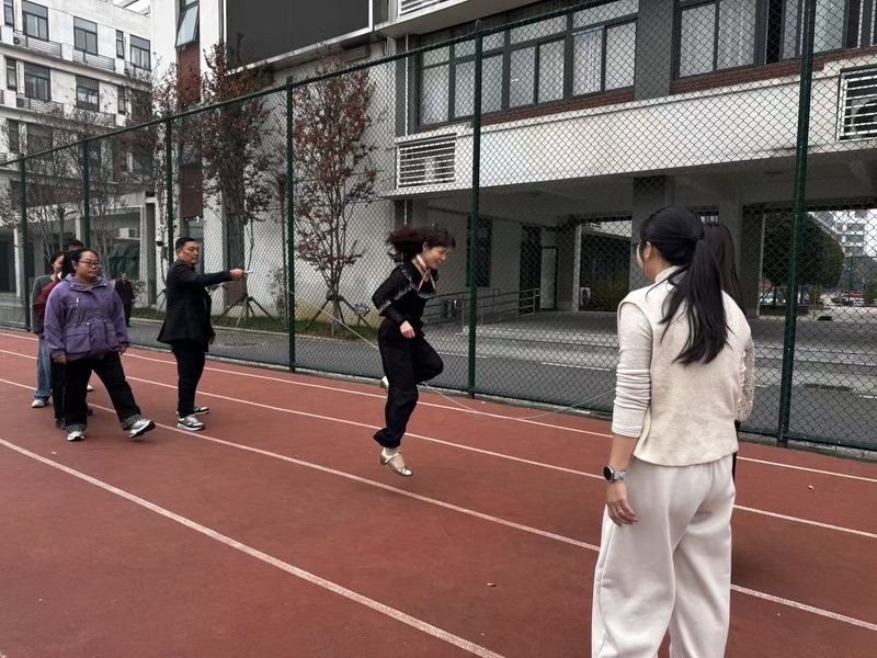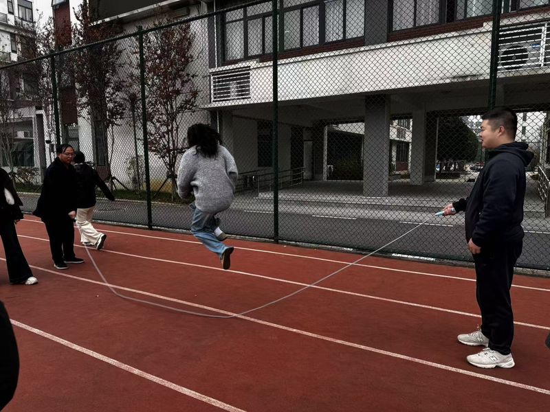随后进行的三分钟集体跳项目将比赛气氛推向高潮。各团队10名选手依次排开,随着摇绳教师发出的信号同步起跳,“一、二、三……”啦啦队成员们整齐地为老师们计数,清脆的数数声与绳子拍打地面的“啪啪”声、师生的喝彩声交织在一起,响彻整个操场。第二团队的选手们配合尤为默契,无论是摇绳教师的节奏把控,还是跳绳教师的起跳时机,都精准无误,连续三分钟未出现一次失误,赢得了现场师生的阵阵掌声。