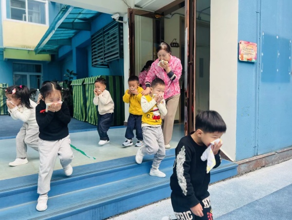 在系列教育活动结束后,幼儿园组织全体师生进行了一场紧张有序的消防应急疏散演练。随着急促的警报声响起,各班教师迅速反应,组织孩子们用湿毛巾捂住口鼻,弯腰低姿,沿着预定的疏散路线,快速、有序地撤离到安全地带。整个演练过程分工明确,行动迅速,达到了预期效果。