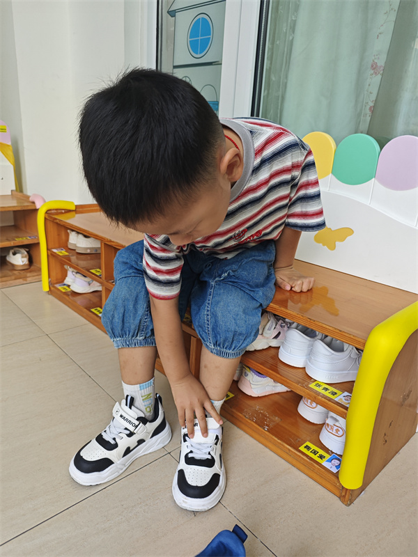 此外,教师引导孩子们认识自己的“小天地”:小鞋柜、小衣柜、贴着自己照片的小毛巾和小床。找到专属物品的过程,就像寻宝游戏,带来了最初的安全感。慢慢地,他们开始学习自己做事情:用小毛巾擦手,双手端稳小水杯,卷起袖子洗手,自己脱鞋。每一次“我会啦!”的欢呼,都让自信的小种子在心田发芽。