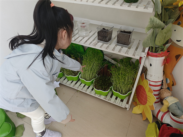豆苗一天天长高,先是长出嫩绿的子叶,像一双小手掌。孩子们又有了新发现:“老师,它像在跳舞!”“长得好像蝴蝶呀。”“它的‘绿头发’越长越高了,就像路灯。”“有点像小树。”“好多高高的呀,真像高楼大厦。”“还像长长的腿。” 孩子们一边观察,一边讨论如何照顾它:“豆子喜欢水,但不能太多。”“它还要晒太阳,才会长得壮。”