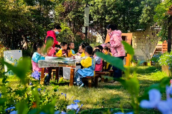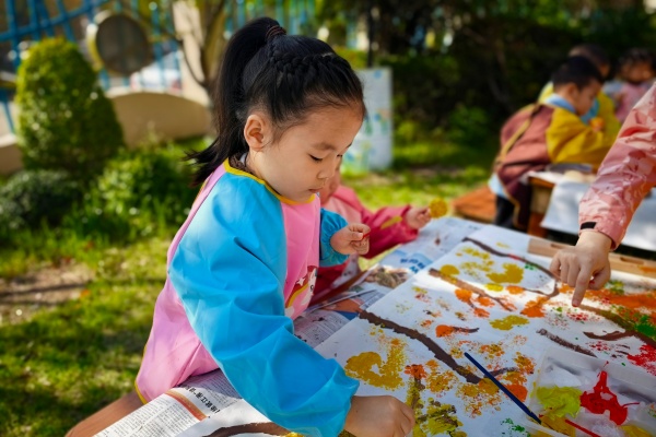 孩子们拿起用气泡膜包裹的海绵戳,轻点画纸:金黄点出银杏的明媚,橙红晕染枫叶的热烈。一场色彩的游戏便让一棵棵生动的秋树立于纸上,户外随风散落“叶子”让纸上充满了自然的气息。