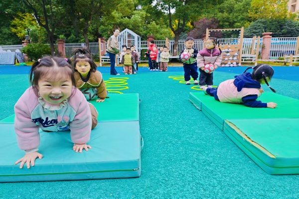 合肥市荣城幼儿园教育集团总园:开展“萌娃足球小健将”足球特色活动为激发小班幼儿对足球运动的兴趣,锻炼肢体协调性与基础运动能力,2025年11月17日,合肥市荣城幼儿园教育集团总园小二班的萌娃们开启了一场充满童趣的足球游戏活动。 活动开场,老师带着孩子们跟着轻快的儿歌做“小身体动一动”热身操:点点头、耸耸肩、摆摆手、弯弯腰、踢踢小脚、转转手腕脚腕,软乎乎的小身子跟着节奏舒展起来,既活动了关节,也让小家伙们快速进入了游戏状态。 “变身小毛毛虫啦!”孩子们趴在地垫上,用肚子顶着足球,小手小脚慢慢往前爬,像毛茸茸的小虫子一样小心翼翼的把足球“运”到终点的小圈里。游戏中不仅锻炼了核心力量,让孩子们学会控制身体与足球的距离,同时还让孩子们在欢乐的氛围中感受到了足球滚动的乐趣。