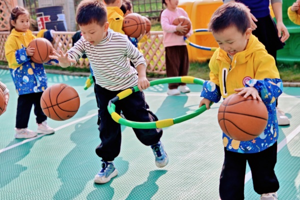 中班组的篮球活动点燃全场热情!热身过后,“篮球飞碟”游戏率先开场,孩子们分组合作,双手紧紧抱住篮球,或是两人默契配合,用呼啦圈稳稳托住篮球向前运送,奔跑中篮球滚动的“咚咚”声与孩子们的笑声交织。“合力运球”环节,幼儿们巧用工具,让篮球在轮胎与障碍间灵活穿梭,考验着彼此的配合默契;“播种机运球”时,孩子们化身灵活的“小播种机”,在圈圈障碍间快速穿梭运球,时而弯腰躲闪,时而加速冲刺,尽显灵动与活力。