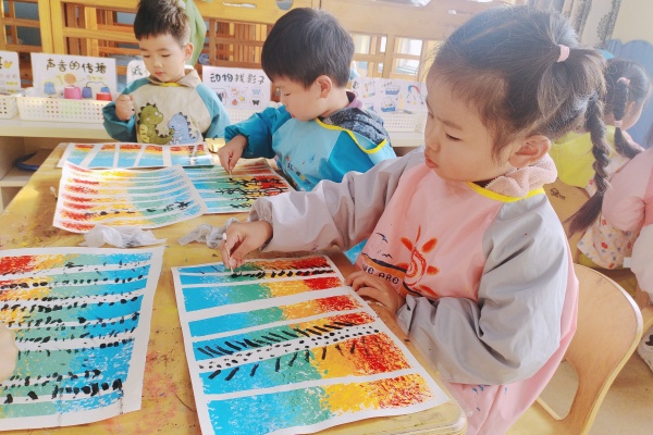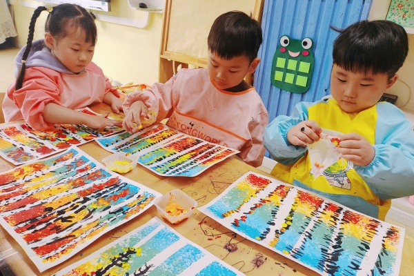 合肥市荣城幼儿园教育集团丽水分园:点染秋林,童绘自然 ——中三班创意点彩活动为引导幼儿感知色彩层次、体验点绘创作的乐趣。2025年11月26日,合肥市荣幼教育集团丽水分园中三班开展“点染秋林,童绘自然”点彩主题活动。活动以“秋日白桦林”为创作载体,聚焦幼儿审美感知与手部精细动作的协同发展,通过“感官浸润—技法探索—自主创作”的递进式设计,让幼儿在艺术实践中亲近自然、表达想象。 活动中,孩子们专注地观察着秋日白桦林的图片,很快便被画面中丰富的点状色块所吸引。他们拿起棉签,尝试用不同的点绘方式表现枝叶的蓬松与树干的斑驳纹理,在实践里感受点的形状与疏密为画面带来的变化。每个孩子都展现出独特的构思:有的用叠色点出繁茂树冠,有的以散点表现落叶纷飞,还有的通过拉大间距让树木更显高挑。最后,他们围坐在展示区前,兴致勃勃地讲述着各自画作中藏着的树林小故事。