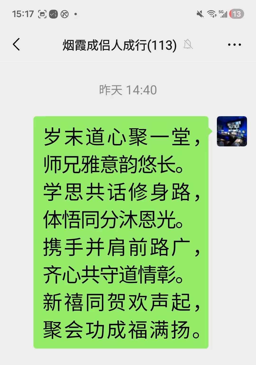 此次年终聚会在欢乐祥和的氛围中圆满结束,但它的意义远不止于此。它为我们指明了未来发展的方向。我们要继续坚守道心,传承和发扬道家文化这一珍贵的非遗传统文化。 我们要将学道心得和修身体悟融入到日常生活中,以道为指引,做一个有道德、有修养的人。同时,我们也要积极参与到文化传承的行动中来,通过各种方式让更多人了解道家文化,感受其独特的魅力。冰城的冬日,见证了我们对非遗传统文化传承的决心和信心。 相信在全体同门的共同努力下,道家文化这一古老而又充满活力的非遗传统文化,一定能够在新的时代焕发出更加璀璨的光芒。让我们携手共进,在传承非遗传统文化的道路上砥砺前行,共贺新禧,共创美好未来! 此次聚会的成功举办,离不开每一位同门的积极参与和付出。冰城的冬日,因为这份团结和努力而更加美好。让我们共同期待下一次的相聚,继续在道的世界里探索前行,为传承和弘扬非遗传统文化贡献自己的力量。愿道法自然,福泽众生;愿非遗传统文化,代代相传,永放光彩!在冰城哈尔滨的美丽冬天里,这场年终聚会成为了一段难忘的记忆,激励着我们在传承非遗传统文化的道路上不断前行。 ( 孙楷炫 马彩仙 ) 审核:张彪