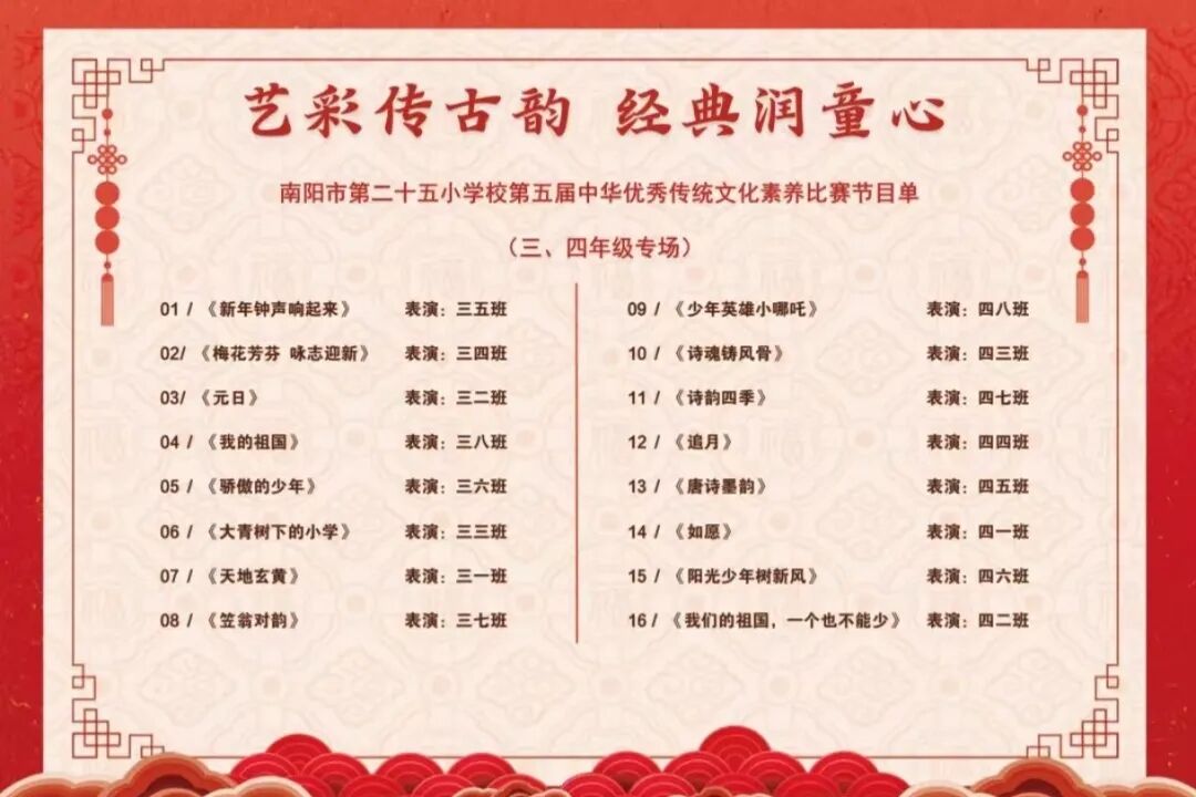 中年级 || 艺彩传古韵 经典润童心岁月添新章,经典咏流传。为传承中华优秀传统文化,厚植少年学子文化自信,南阳市第二十五小学校于2025 年12月30日上午继续举行了“艺彩传古韵 经典润童心”第五届中华优秀传统文化素养比赛(三、四年级专场)。品经典之韵,扬文化之美,让传统文化浸润童心,涵养少年风骨。 盛情开幕 童声唱雅韵,少年诵经典。在这美好时刻,校园里诗意流淌。活动开场,师生齐聚,在主持人对经典文化的深情阐释中,大家满心期待,共赴一场经典的视听盛宴。