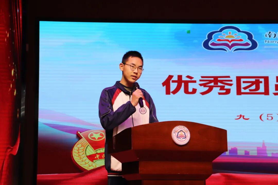 06 优秀团员代表发言 九(5)班刘赛一同学作为优秀团员代表,分享了自己在团组织中的成长经历和心得体会,鼓励新团员们珍惜团组织的培养机会,积极参与团组织的各项活动,努力成为新时代的优秀青年。