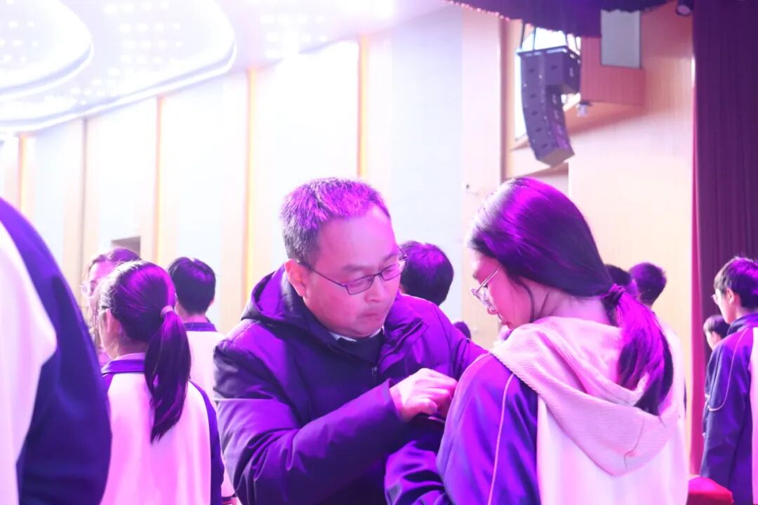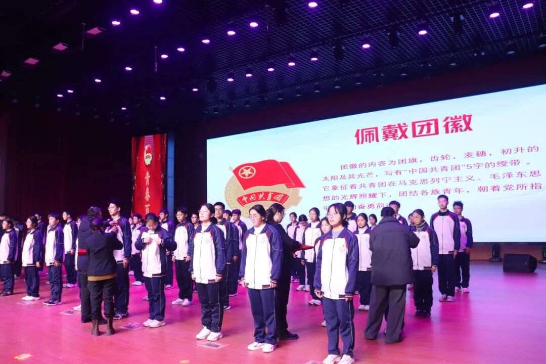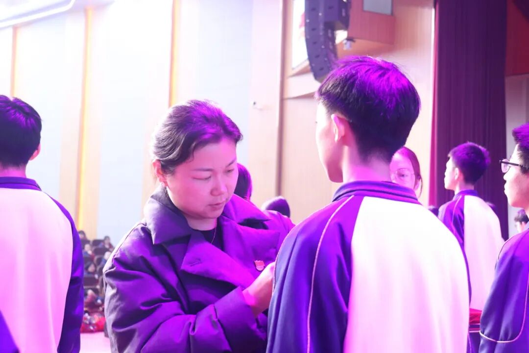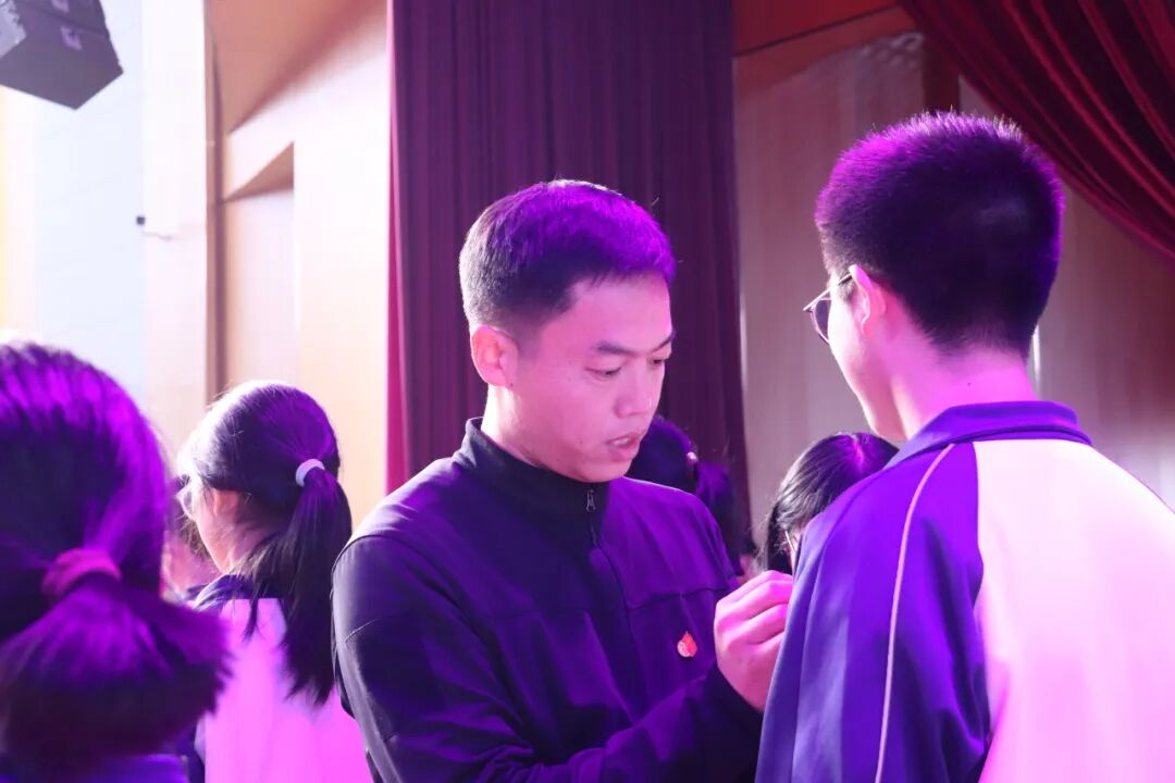 校领导为新团员佩戴团徽,小小的团徽缀于胸前,既是荣誉的象征,更是责任的嘱托。
