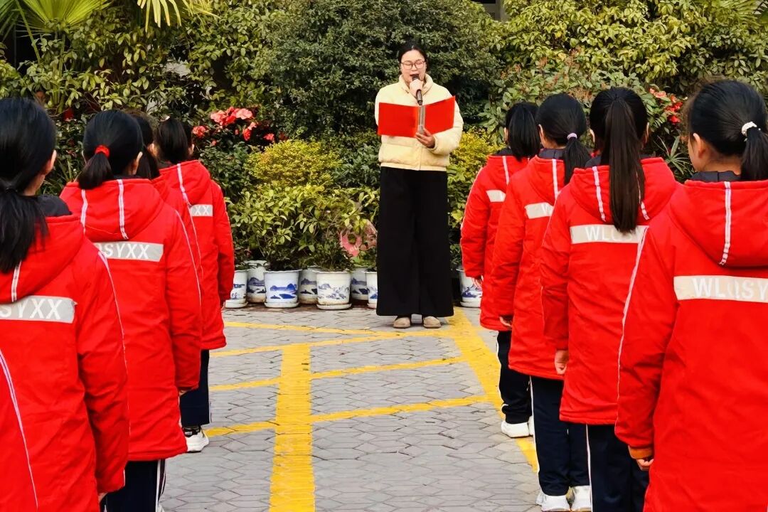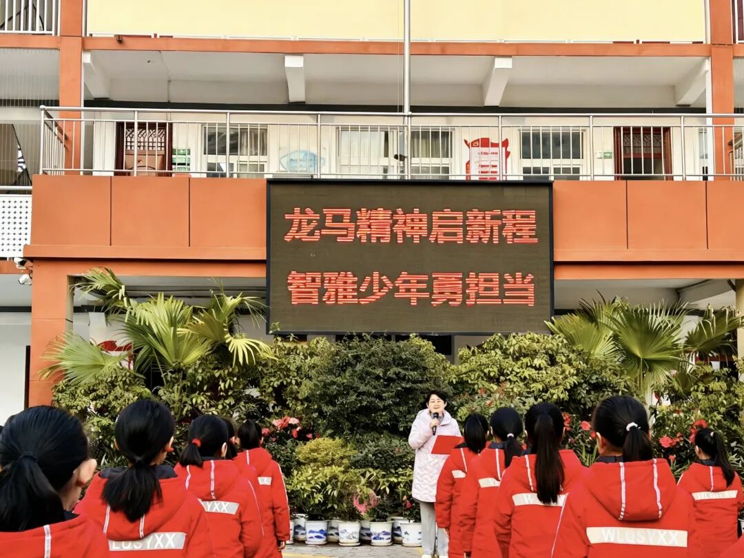 首先,学校党总支书记李亚欣以“龙马精神启新程 智雅少年勇担当”为主题,讲授新学期思政第一课。李书记围绕爱国、理想、责任与成长,阐释爱国真谛,号召同学们争做心中有爱、勤学善思、勇于担当的“智雅少年”,并从行为习惯、知识基础、理想信念等方面提出要求,鼓励大家以理想为灯、以奋斗为桨,勇毅前行,同时也为全体教师送上美好祝福。 接着,五二班学生代表罗欣悦同学国旗下发言,她从校园礼仪细节出发,呼吁同学们从规范穿着校服、拉好校服拉链等小事做起,以自律彰显品格,以细节践行文明,争做新时代优秀学生。