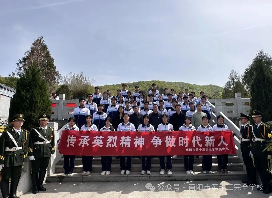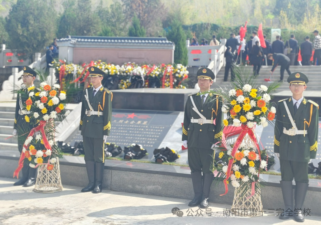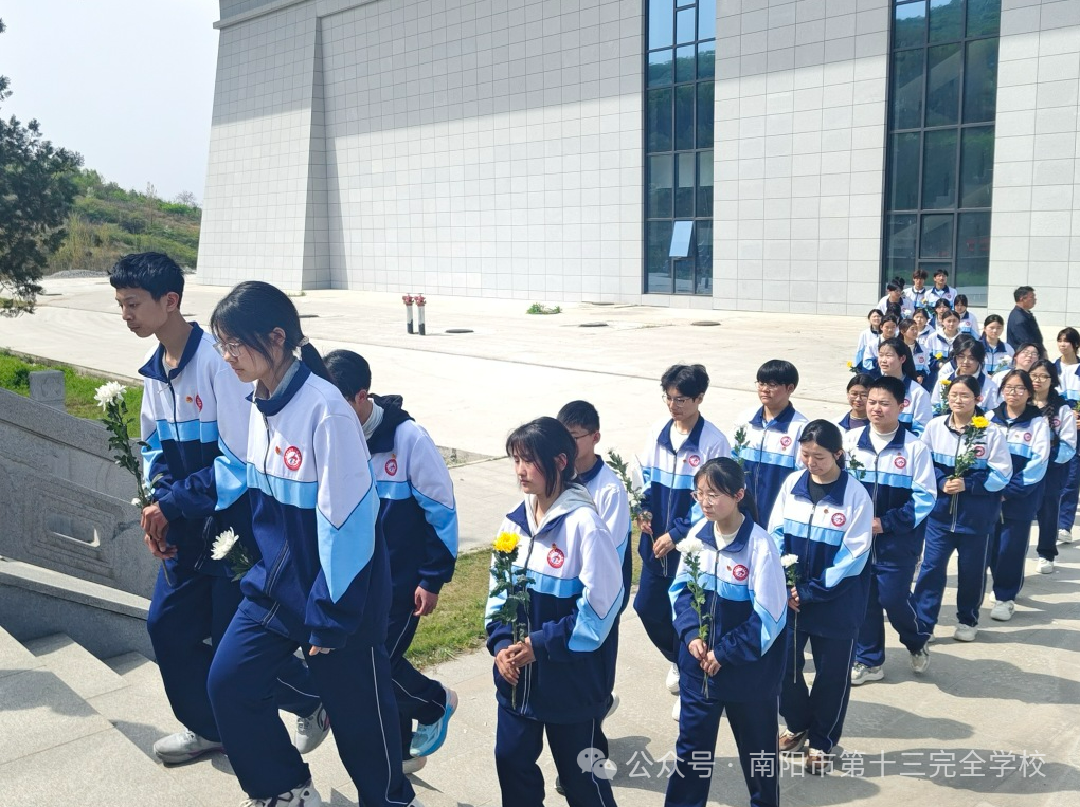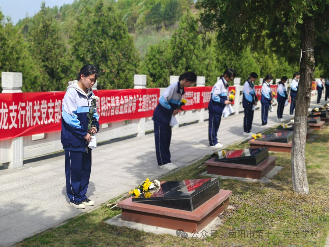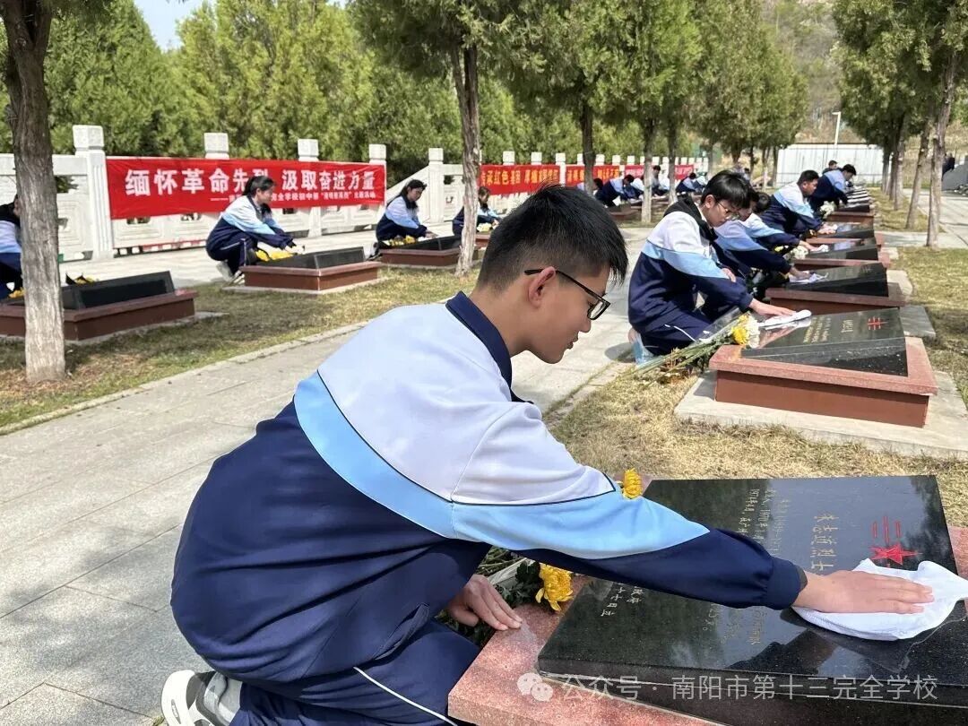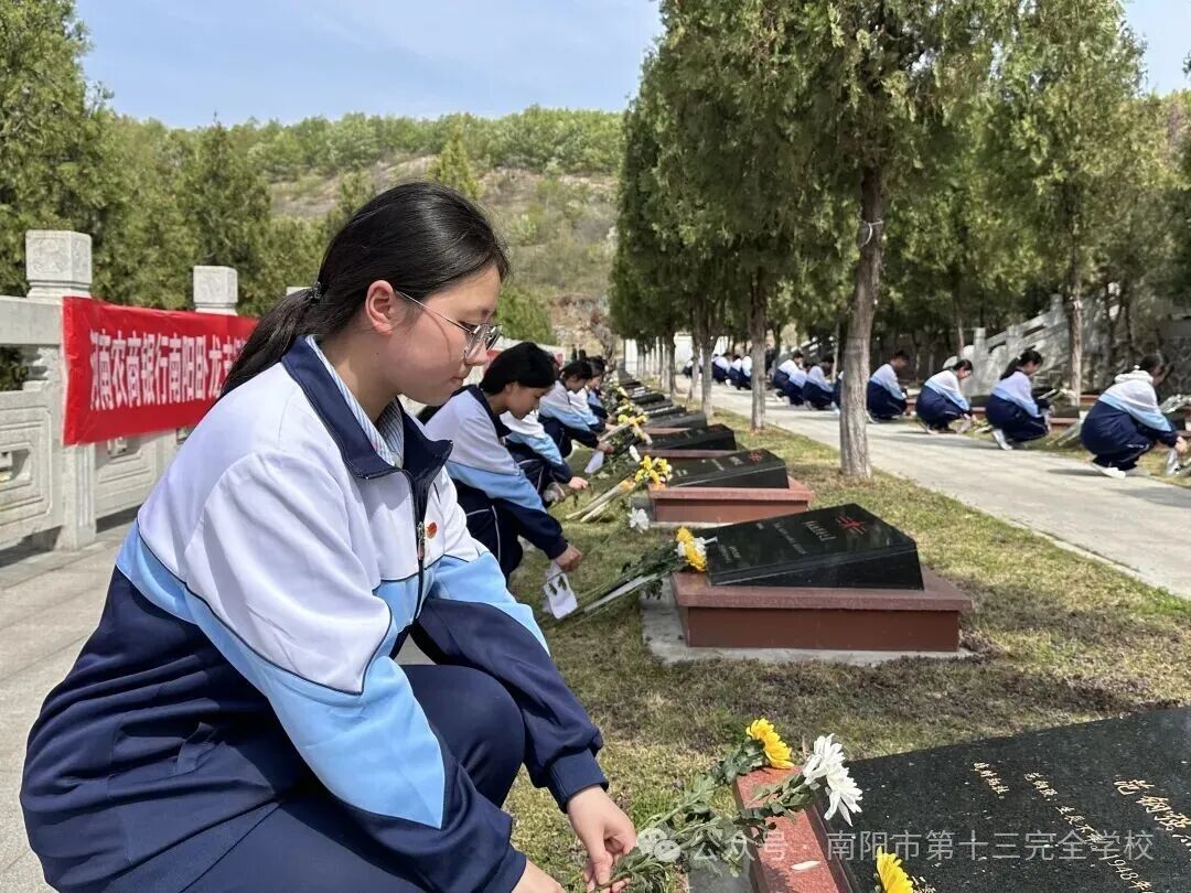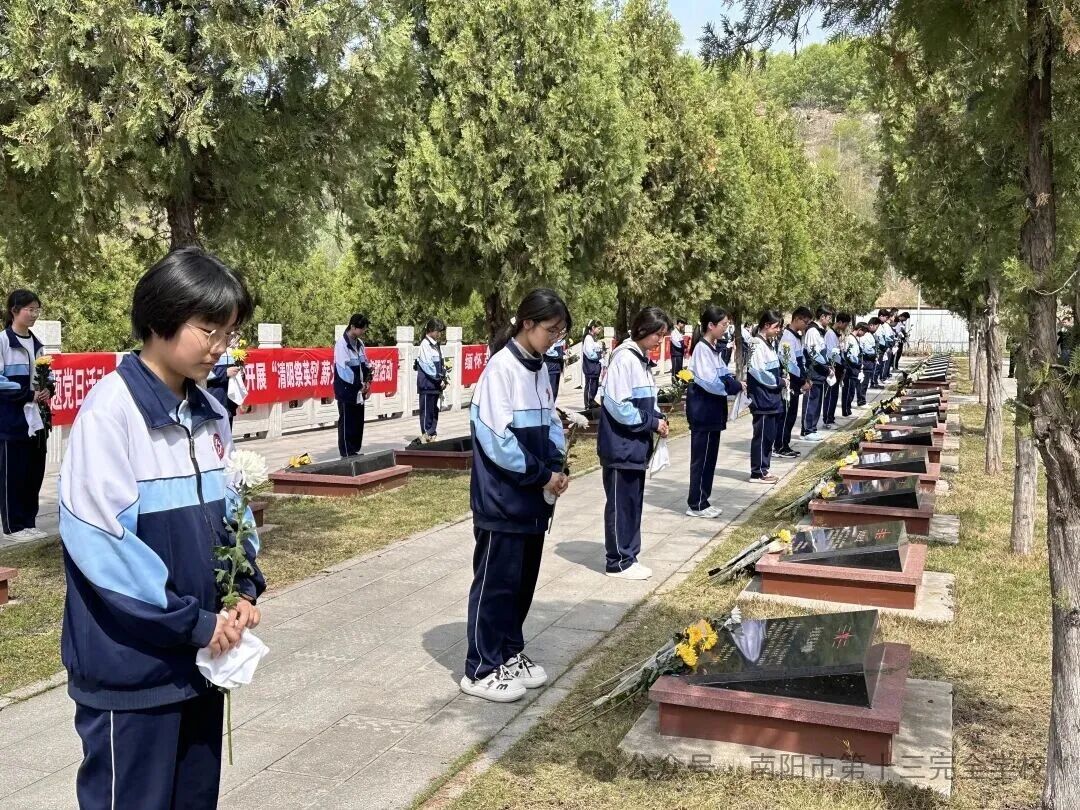 南阳市第十三完全学校高中部清明主题教育活动春风送缅,松柏含哀;缅怀先烈,矢志传承。为深切缅怀革命先烈的丰功伟绩,传承红色精神,厚植师生爱国情怀,南阳市第十三完全学校高中部开展清明祭英烈主题教育活动,通过烈士陵园祭扫、主题黑板报创作两大形式,让红色基因根植心底,让英烈精神代代相传。 烈士陵园祭扫:缅怀忠魂 砥砺初心