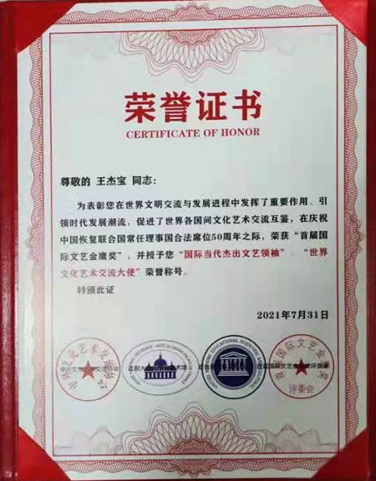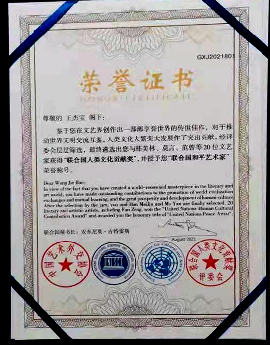 人海信息山东讯(张春兄 冯爱云) 近日,中国国礼艺术家、羲之文化传承人、著名书法家王杰宝先生,收到来自联合国秘书长安东尼奥·古特雷斯先生签发的聘书,聘任王杰宝为联合国教科文组织艺术顾问,并授予“联合国和平艺术家”称号。此前,王杰宝先生曾获得由联合国教科文组织颁发的“联合国文化艺术勋章”证书,同时获得由联合国教科文组织、世界文化艺术交流网、日本美术协会、中意文化艺术联合会联合评选的“联合国艺术终身成就奖”,并被授予“世界艺术功勋人物”等称号。