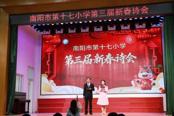 以文化人,向美而行。为丰富教师精神文化生活,提升“以人育人 以文化人”的人文素养,唤醒流淌在中华民族血脉里的文化基因和家国情怀,2026年2月5日立春刚过,南阳市第十七小学第三届新春诗会在二楼报告厅温情启幕。全体教师在诗意流淌中共贺春回大地,在经典咏诵里抒发育人情怀,一场兼具文化底蕴与教育温度的诗意盛宴,又一次徐徐展开。本次新春诗会以“诗意人生 向美而行”为主题,共分为“春之韵·万物逢新”“文之魂·经典流芳”“国之美·山河颂歌”“心之向·步履与共”“新之愿·岁启华章”五大篇章,20首经典诗歌美文依次在舞台