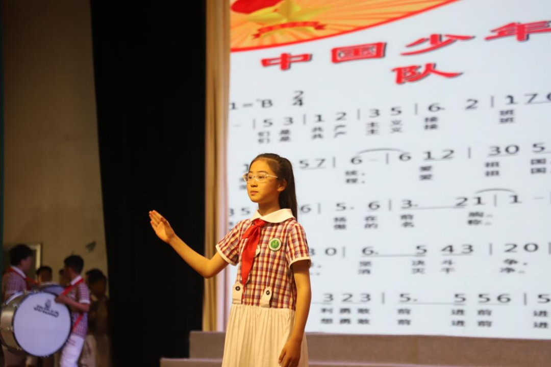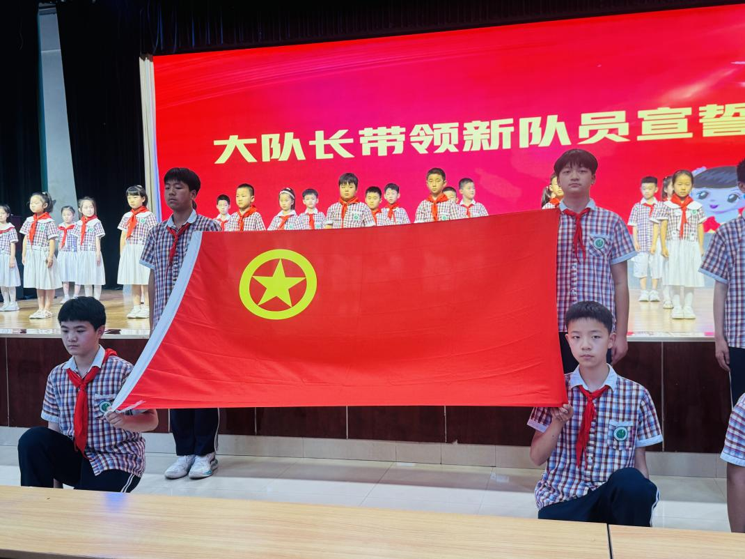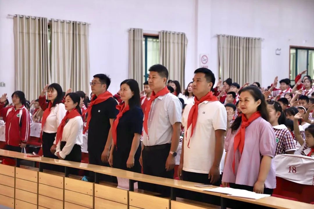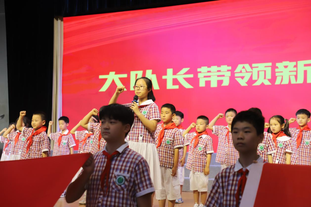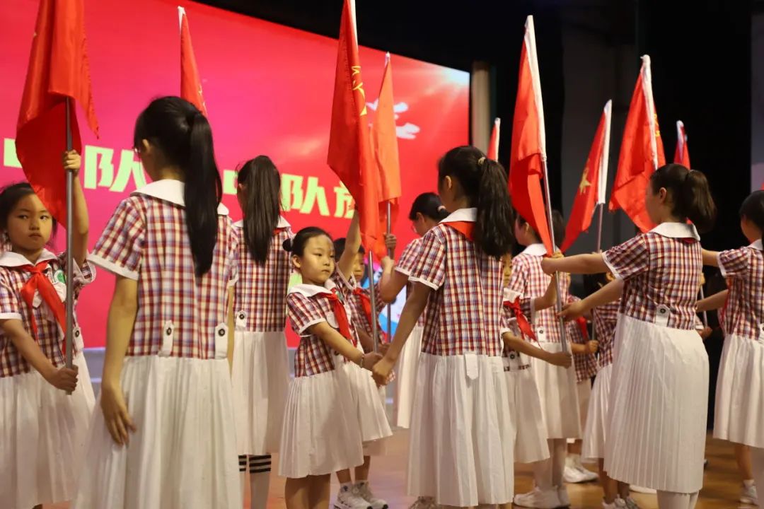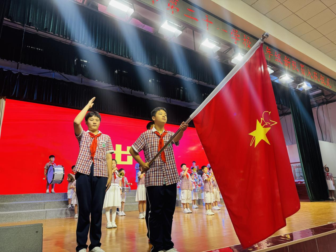 在雄壮的少先队出旗曲中,鲜艳的队旗迎风入场,全体肃立,目光如炬。激昂的队歌声中,新老队员以铿锵誓言,诠释对红领巾的赤诚信仰。