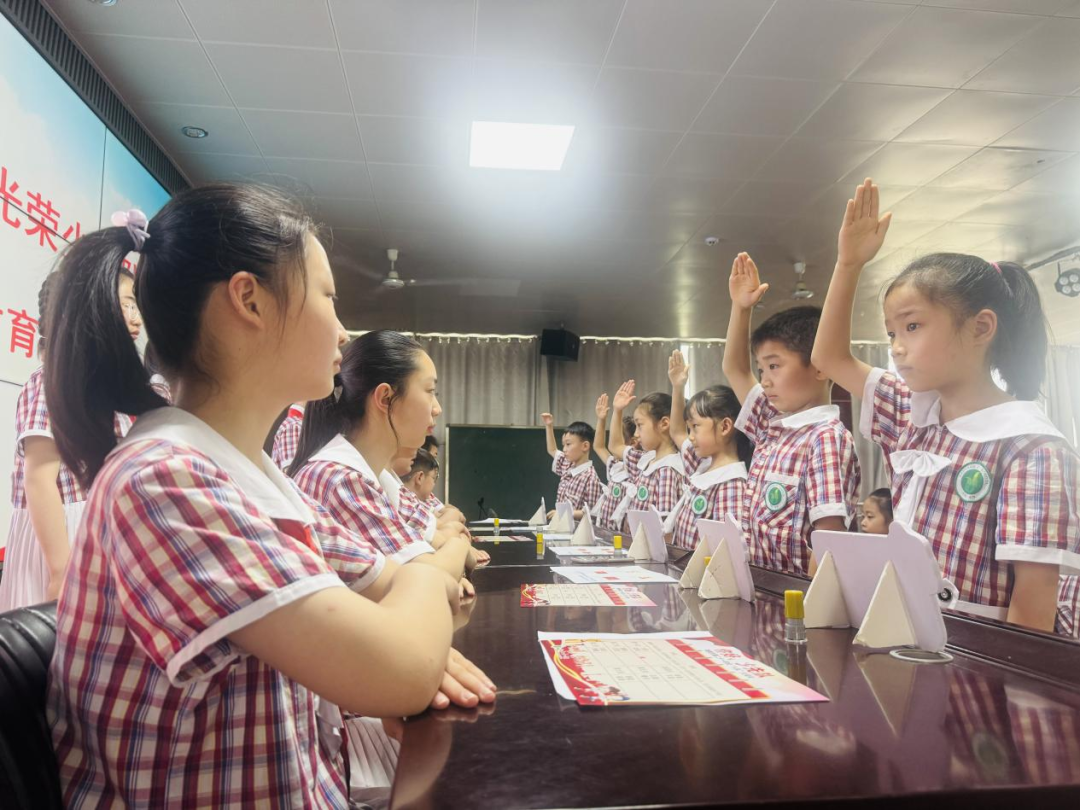 大队长陈子乔高举右拳,带领新队员在队旗下庄严宣誓。铿锵誓言如晨钟激荡,清澈目光中跃动着信仰的光芒。这掷地有声的承诺,是红领巾最动人的初啼!