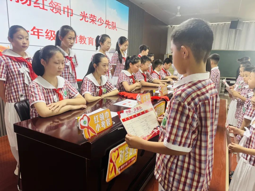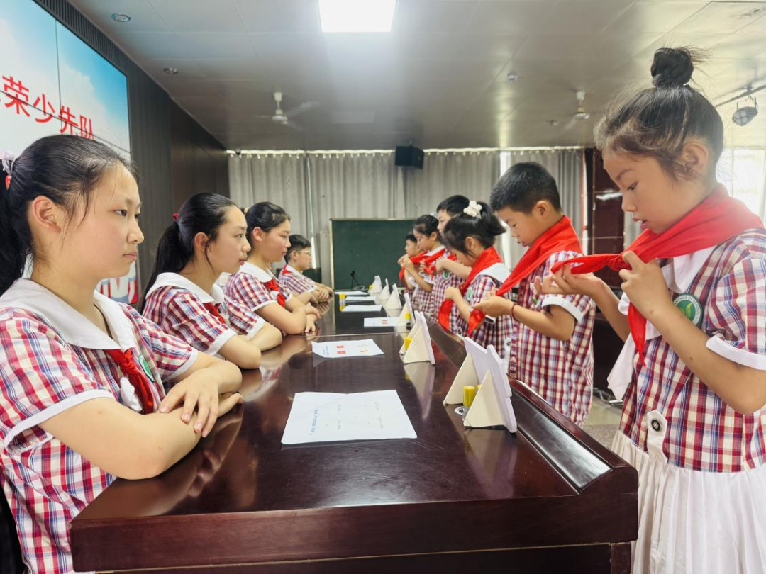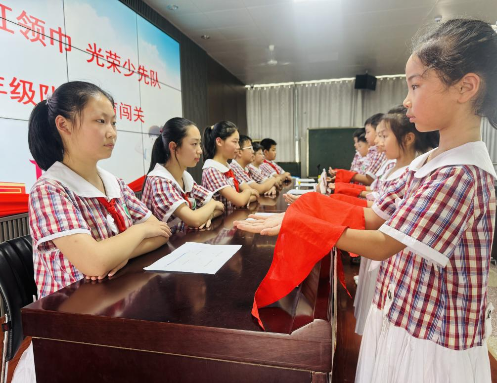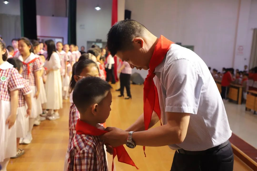 校领导及老队员为新队员们佩戴红领巾,一抹鲜红系满殷殷期望;党团队三旗传递,象征着红色血脉永续流淌。红领巾飞扬,映照着队员们自豪的笑靥,此刻,少先队员正式肩负起时代的荣光!