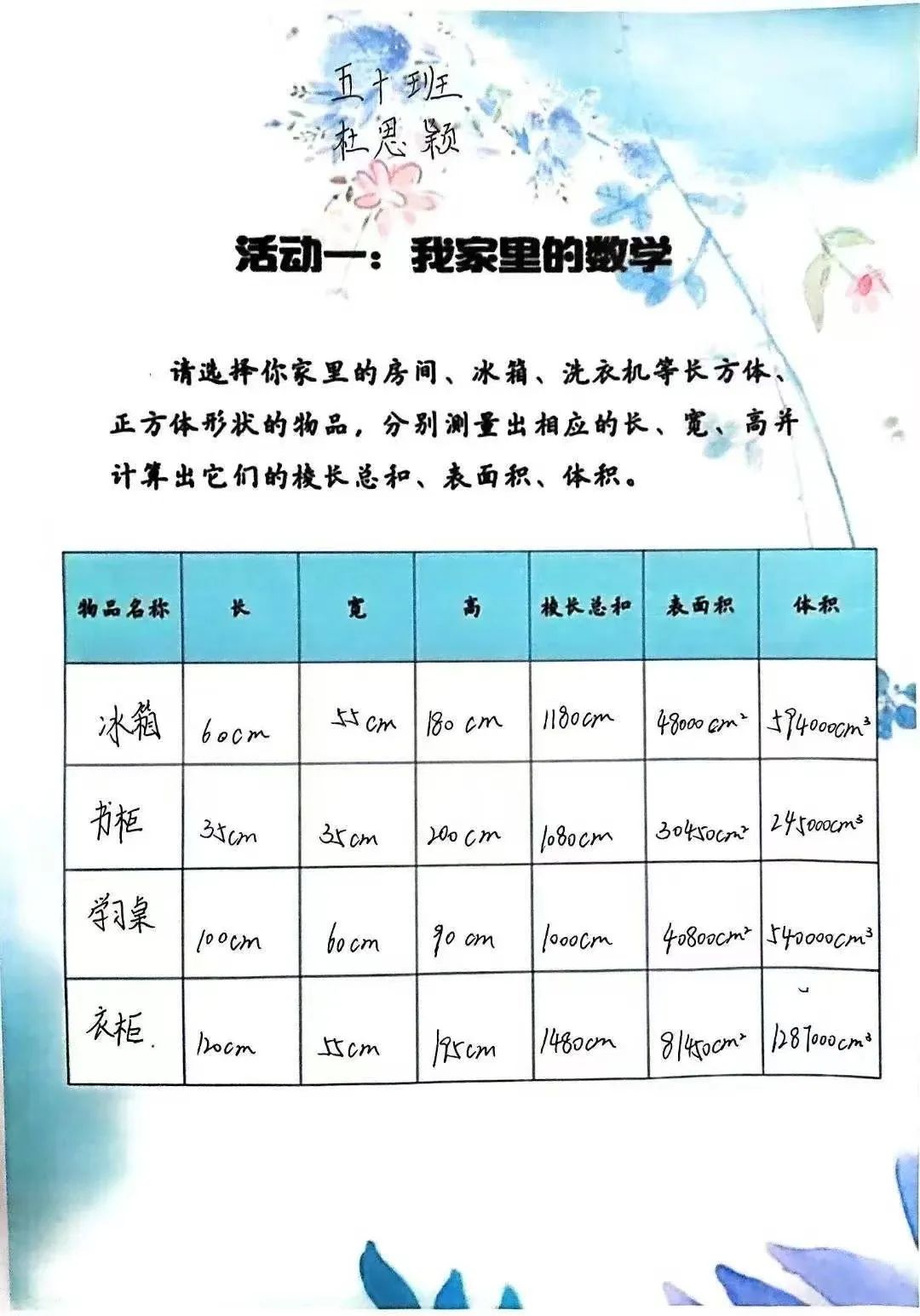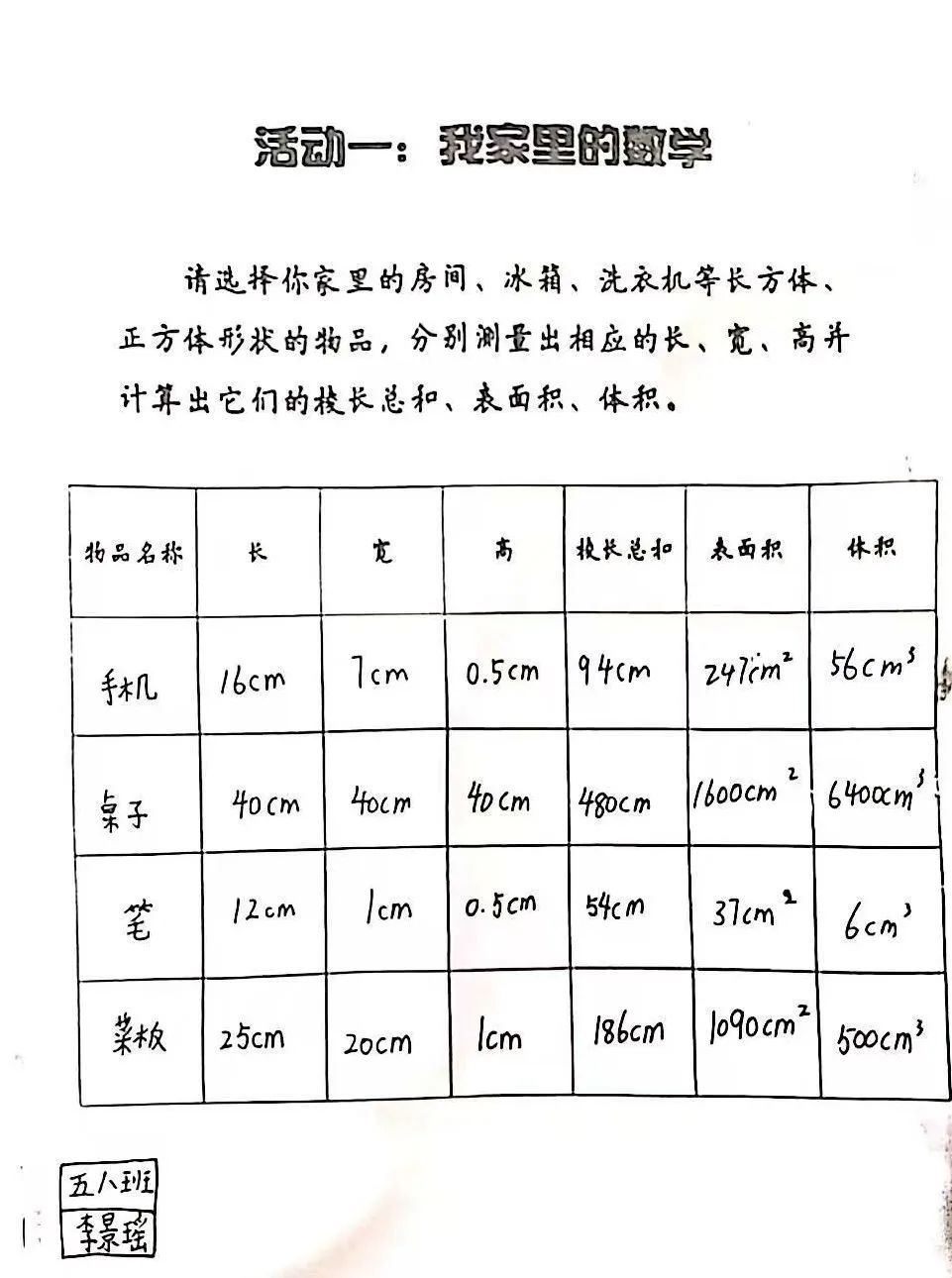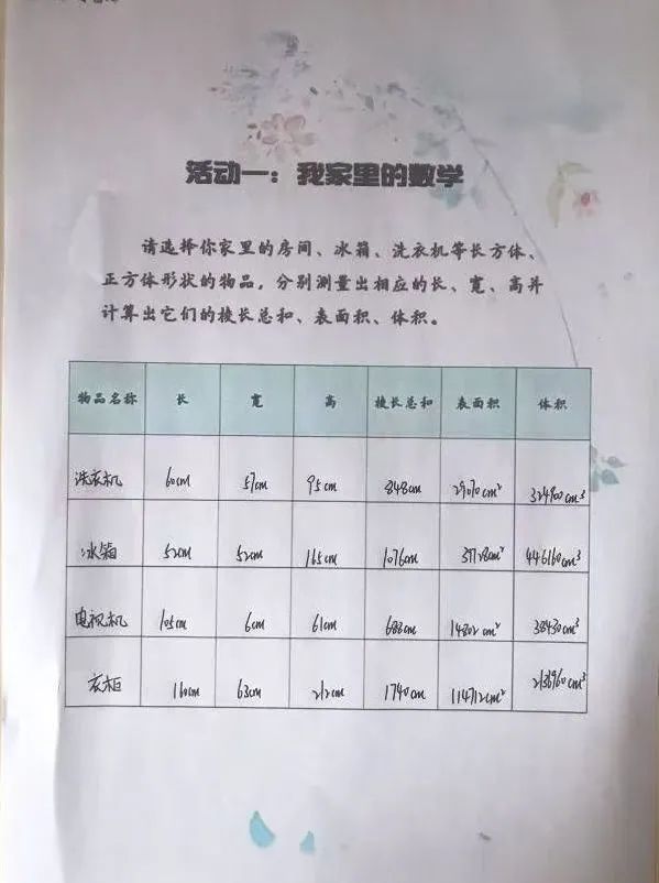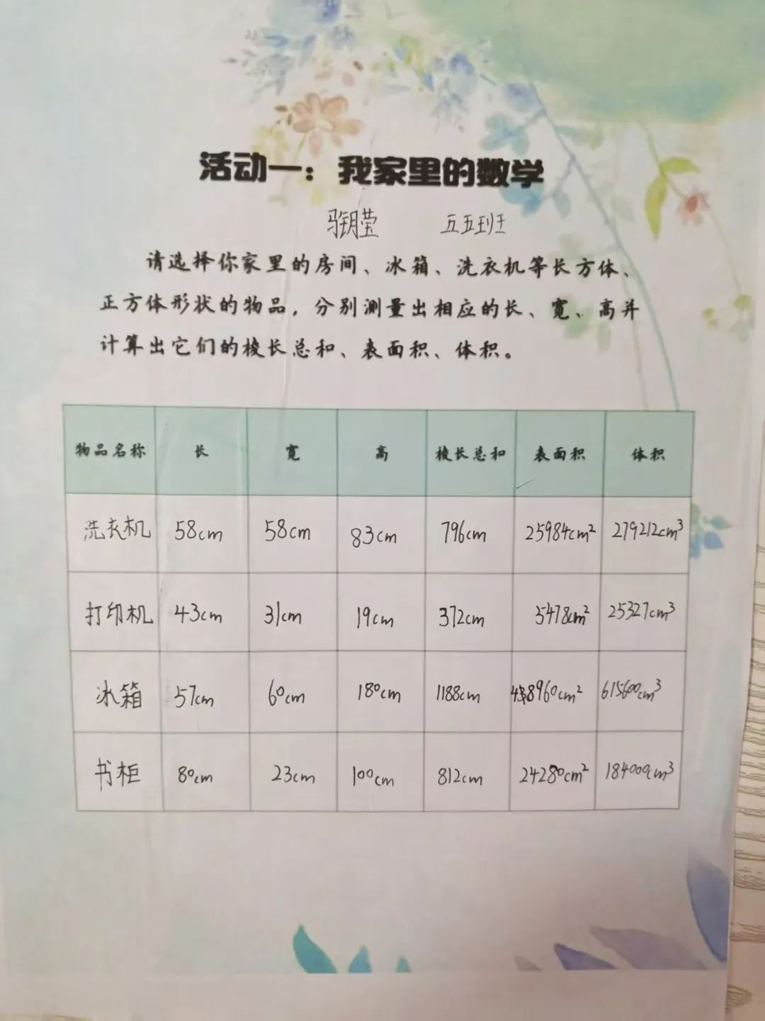 这个暑假,孩子们化身"生活测量师",用数学的眼光重新认识身边的世界。大家认真测量家中冰箱、洗衣机等物品的长宽高,运用数学公式计算棱长总和、表面积和体积,在实践中真切体会到数学与生活的紧密联系。通过这样的活动,抽象的数学知识变成了解决实际问题的有力工具,让孩子们收获了不一样的成长体验。