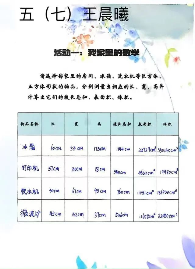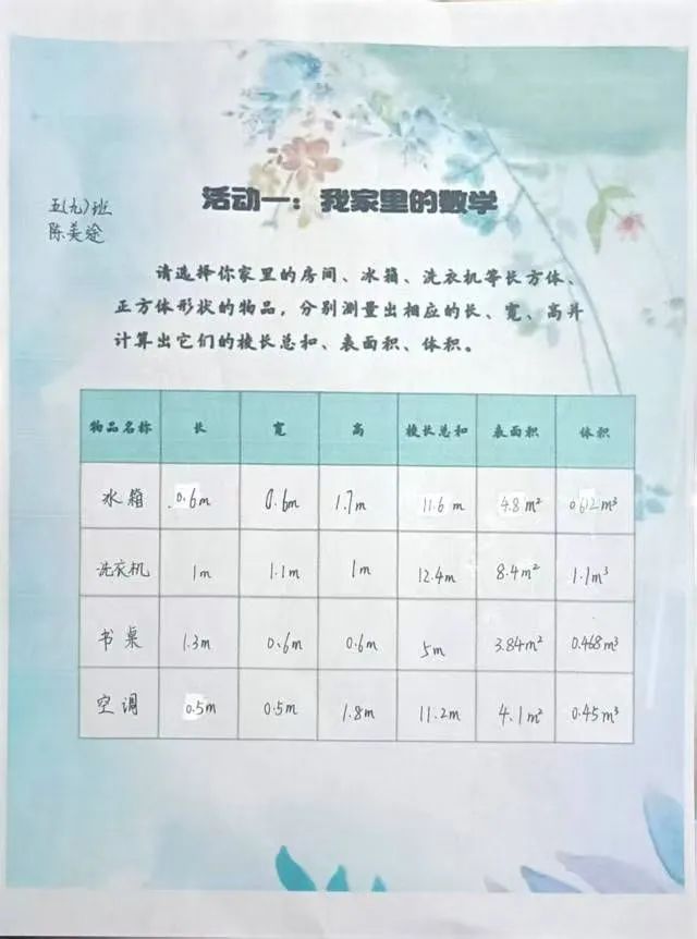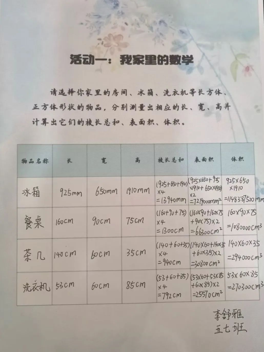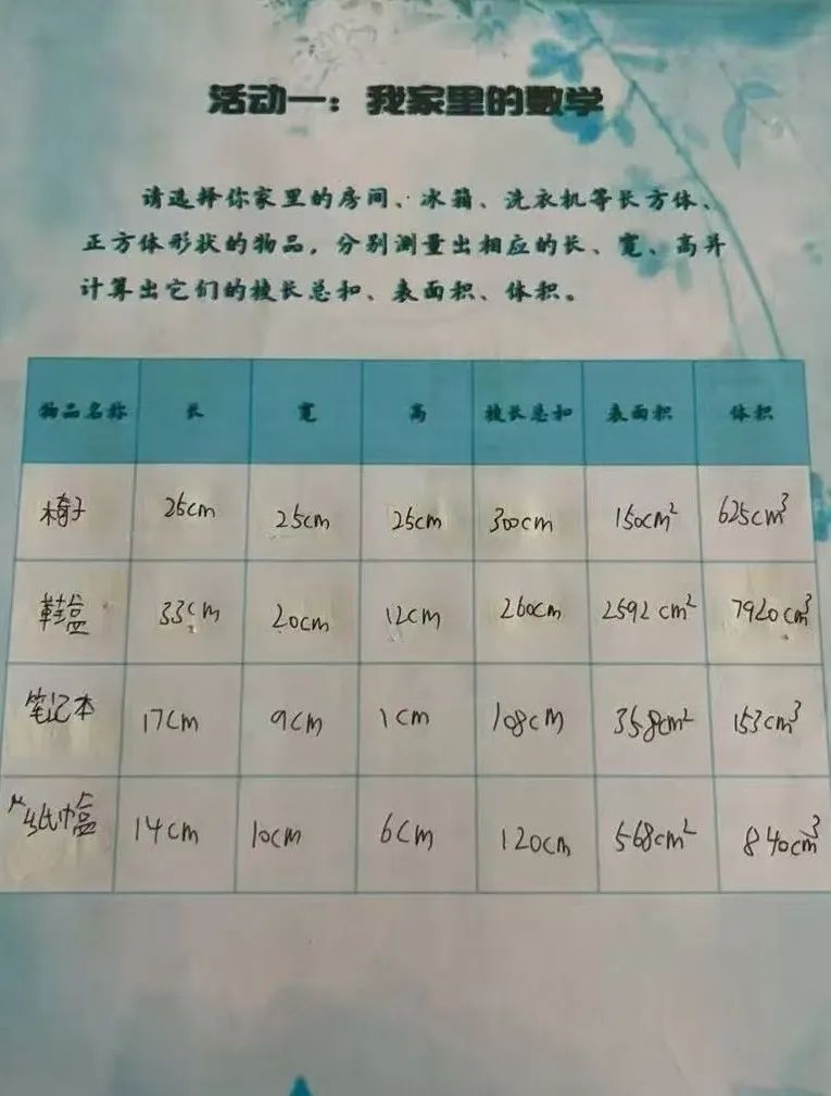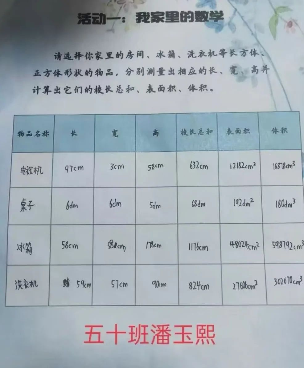 这个暑假,孩子们化身"生活测量师",用数学的眼光重新认识身边的世界。大家认真测量家中冰箱、洗衣机等物品的长宽高,运用数学公式计算棱长总和、表面积和体积,在实践中真切体会到数学与生活的紧密联系。通过这样的活动,抽象的数学知识变成了解决实际问题的有力工具,让孩子们收获了不一样的成长体验。