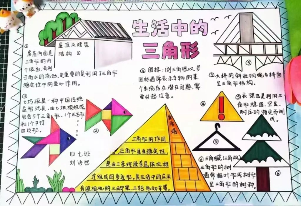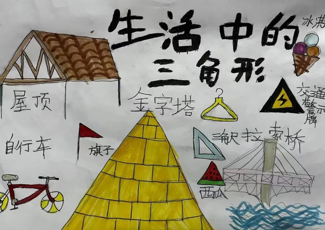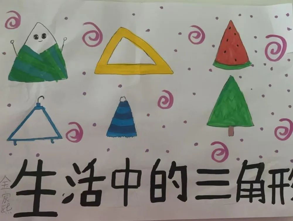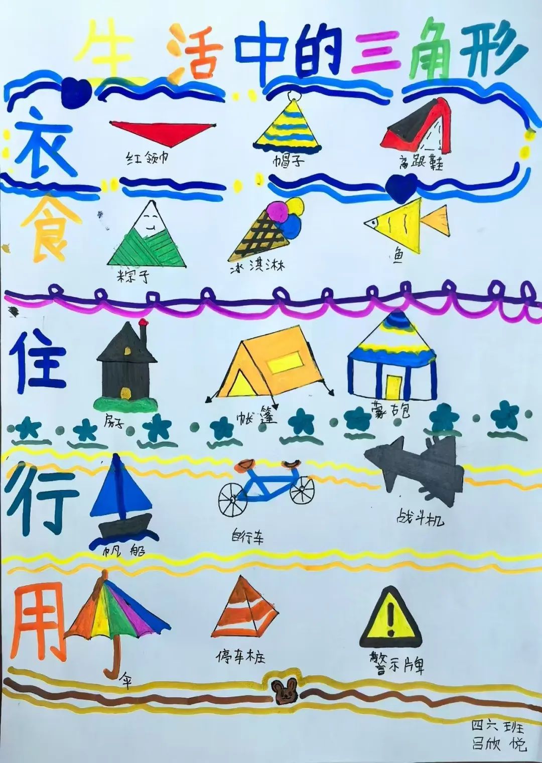 观察中发现,笔尖下创造,实践中领悟。暑假实践作业探索之旅中,孩子们充分发挥主动性,将数学知识运用到实际生活中,不仅感受到动手的快乐,也体验到成功的满足,同时理论与实践相结合,加深了对轴对称图形和三角形的认识,感悟数学美,体会数学的魅力。