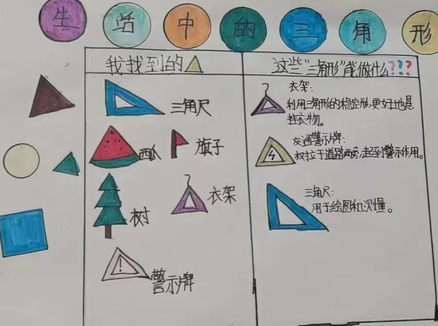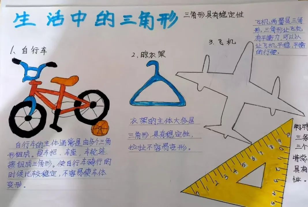 数学源于生活,又应用于生活。当课本上的三角形走进现实,化作自行车的车架、三角尺的轮廓、衣架的造型......孩子们才真正理解:原来几何知识并非冰冷的图形,而是与生活息息相关的实用智慧。这种独特的学习视角,不仅唤醒了大家对数学的热情,更让抽象概念变得触手可及。现在,让我们跟随同学们的脚步,去发现更多生活中的数学之美!
