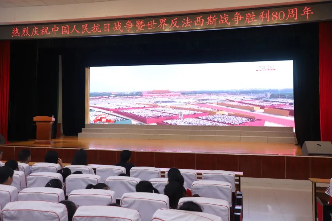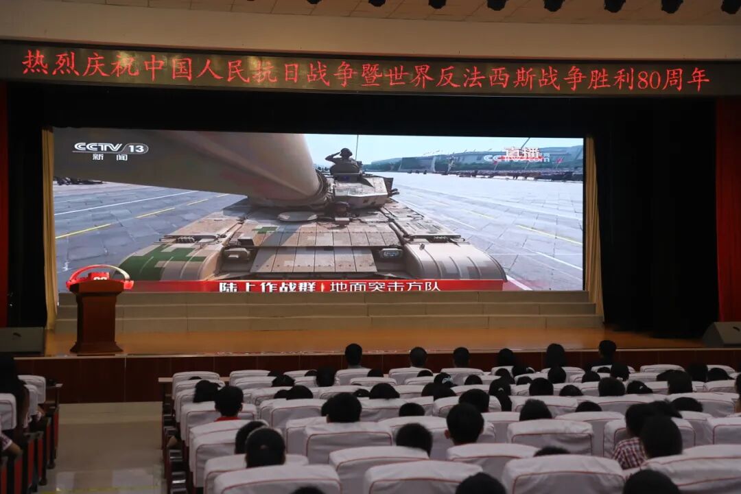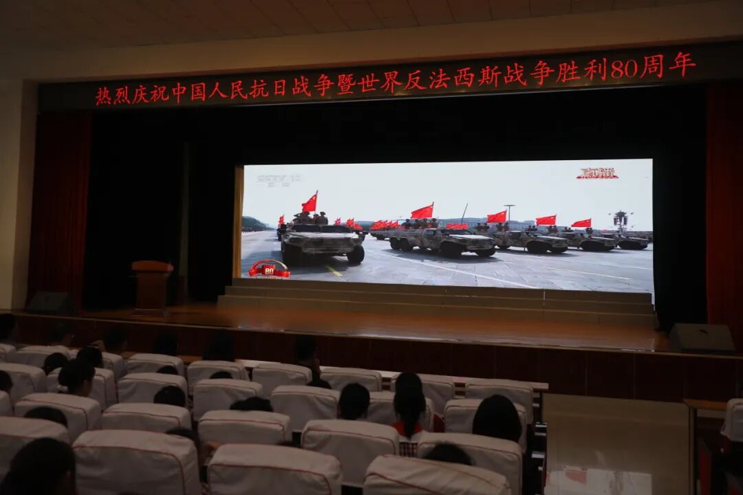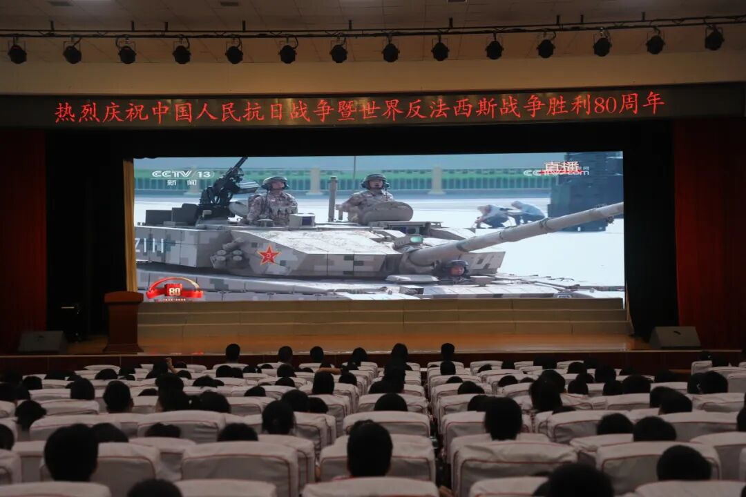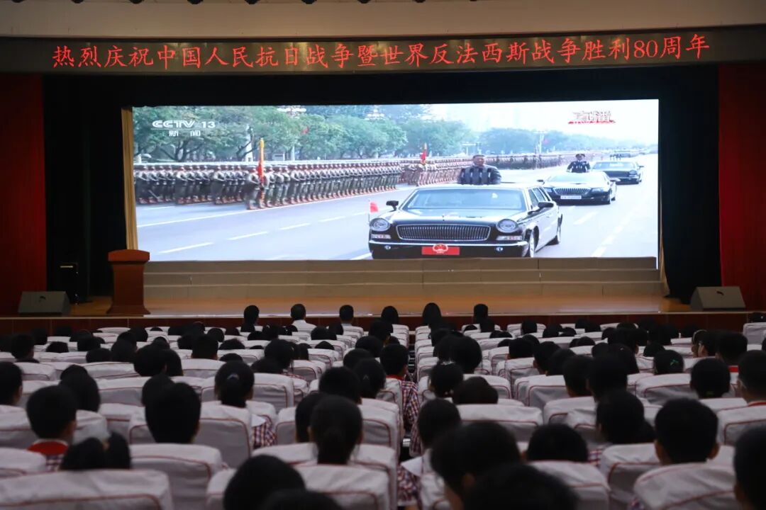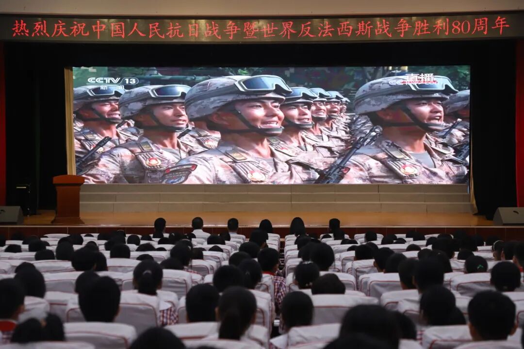 025年9月3日是中国人民抗日战争暨世界反法西斯战争胜利80周年纪念日。为铭记历史、缅怀先烈、珍爱和平、开创未来,深刻感受国家富强、民族振兴的宏伟气象,激发全体师生的爱国热情和民族自豪感,我校开展了“观礼阅兵式,铭记英雄史”主题活动,组织全体师生集中观看“纪念中国人民抗日战争暨世界反法西斯战争胜利八十周年阅兵仪式”现场直播活动。卧龙区退役军人事务局双拥优抚科科长、我校国防教育副校长陈峰举同志,教体局体卫艺科赵保健科长,胡玥老师和我校领导全程参与活动。