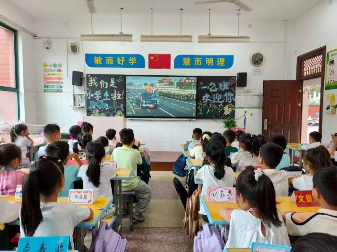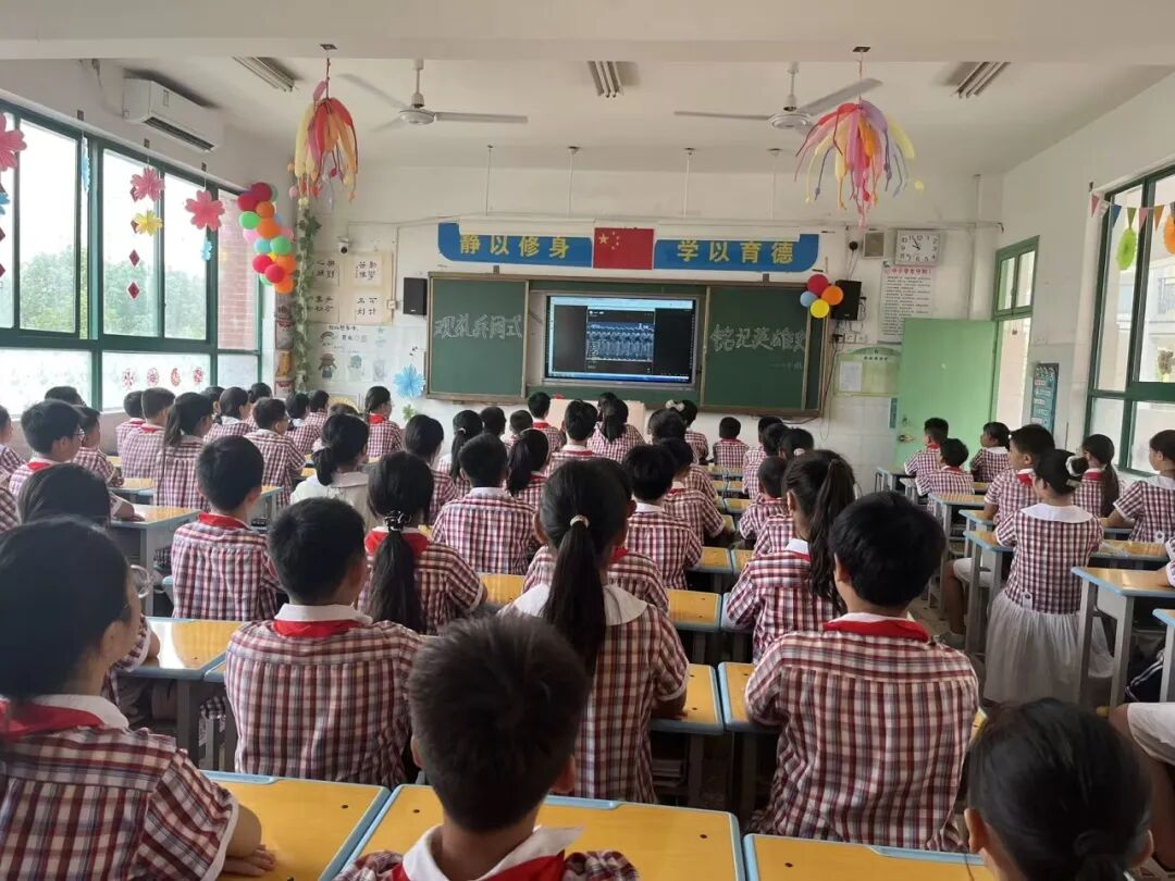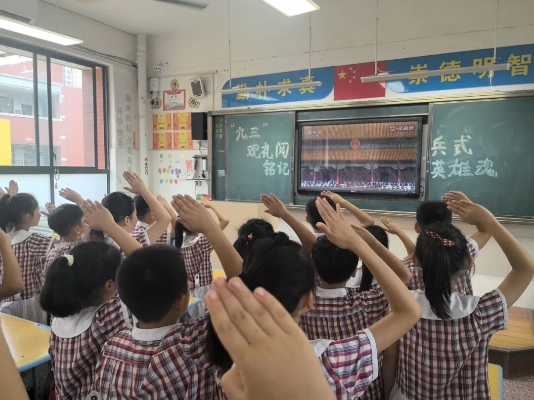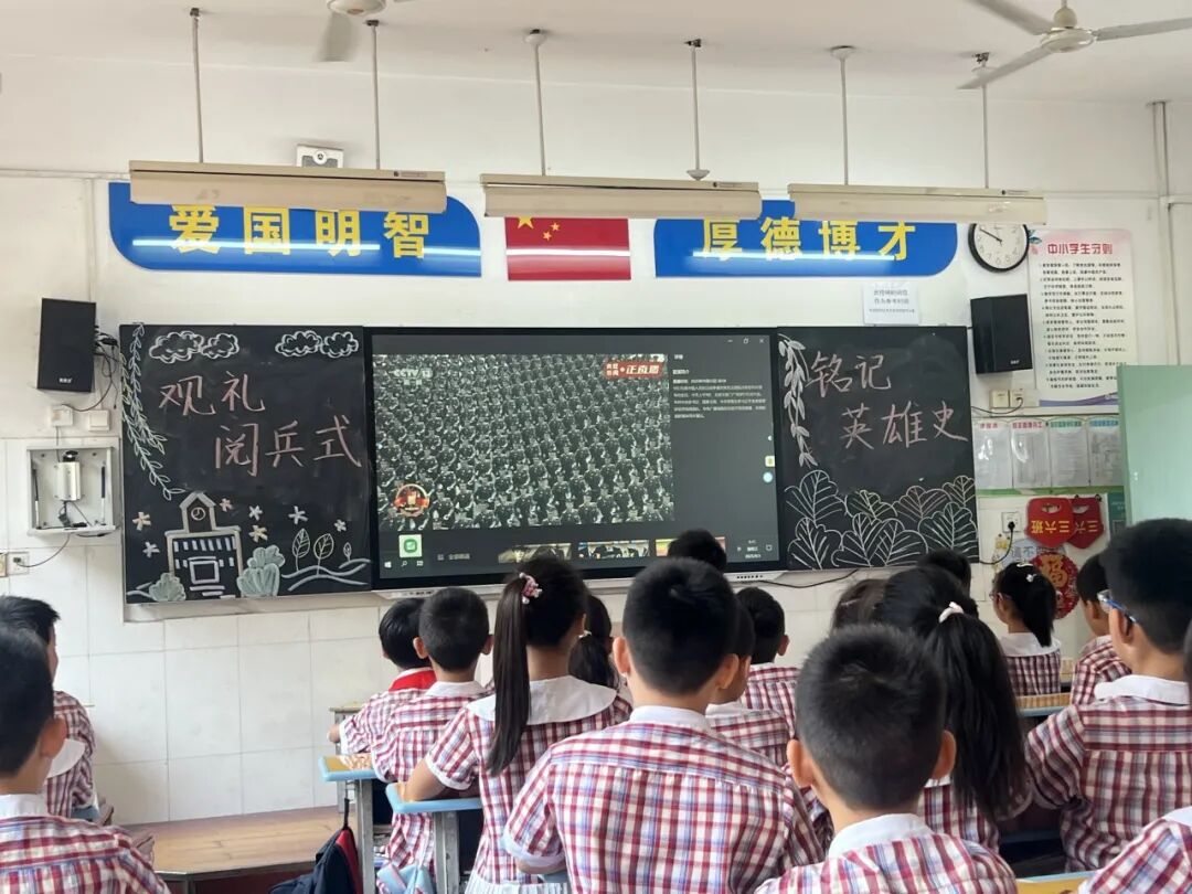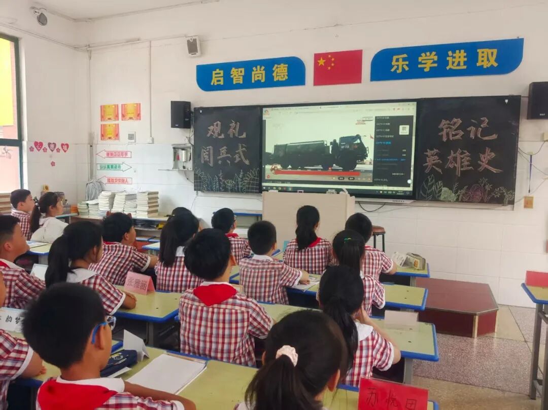与此同时,热烈的氛围充盈着校园的角落,我校其他班级也精心准备,组织学生在教室里观看阅兵式,并开展主题班队会,学生谈感想、说感悟,在交流中把爱国情、强国志、报国行熔铸为成长的坚定信念 。