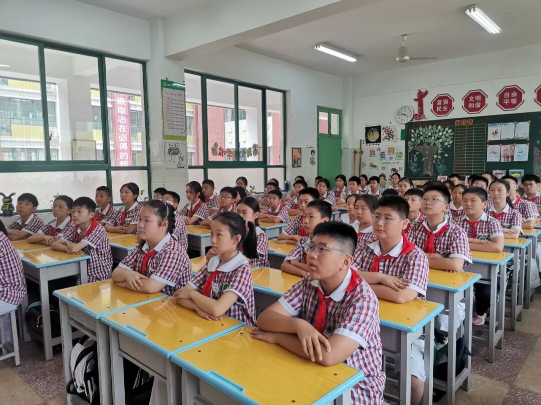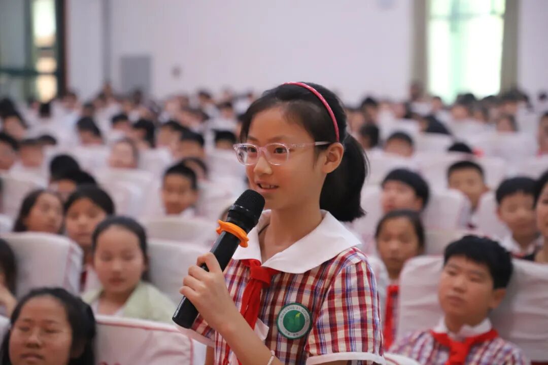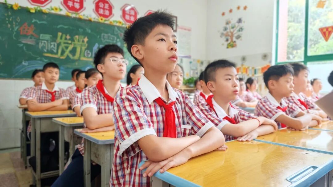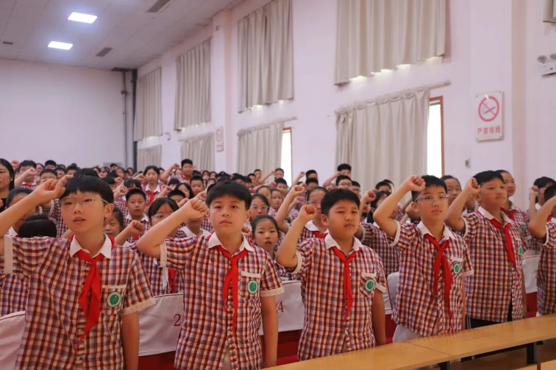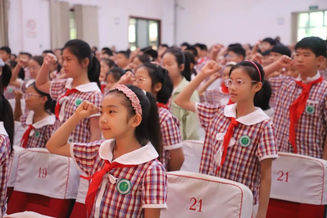 受阅将士的铿锵步伐,是坚守与担当的勋章;大国重器的威武亮相,是自强与底气的见证。阅兵式结束后,学生们难掩激动心情纷纷发言,讲述阅兵盛典带来的震撼与思考,传递新时代学子对家国的热爱、对责任的理解,以及以青春之力守护这份荣光的决心。在大队长的带领下,少先队员们共同宣誓,语气激昂,目光坚定。