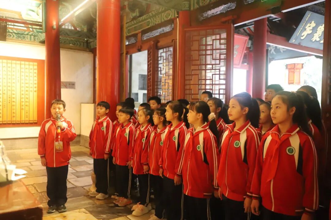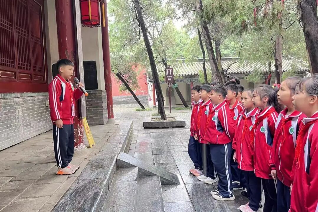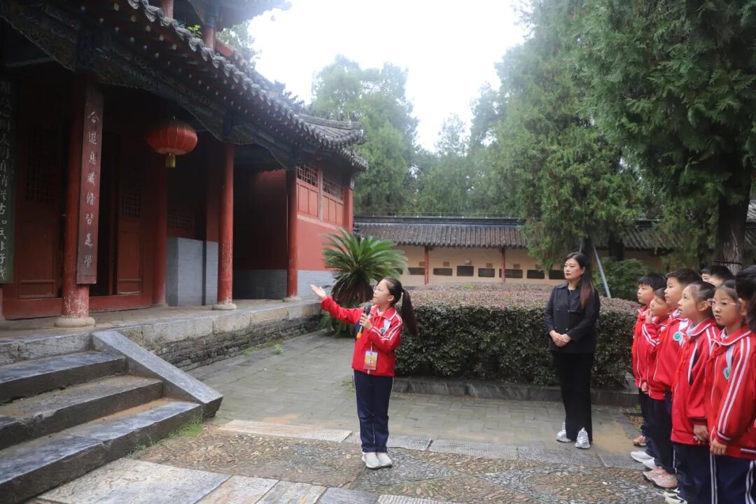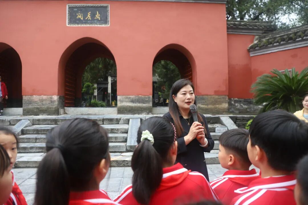 从宏伟的大拜殿到诸葛草庐,从《出师表》碑刻到半月台,小小讲解员们用稚嫩却坚定的声音,将诸葛亮的生平事迹、智慧谋略娓娓道来。“诸葛亮在南阳隐居期间,虽耕读于陇亩,却心怀天下,最终辅佐刘备建立蜀汉政权……”清晰的讲解、生动的故事,不仅展现了少年们对历史的深刻理解,更让在场师生仿佛穿越千年,置身于那个群雄逐鹿的三国时代。