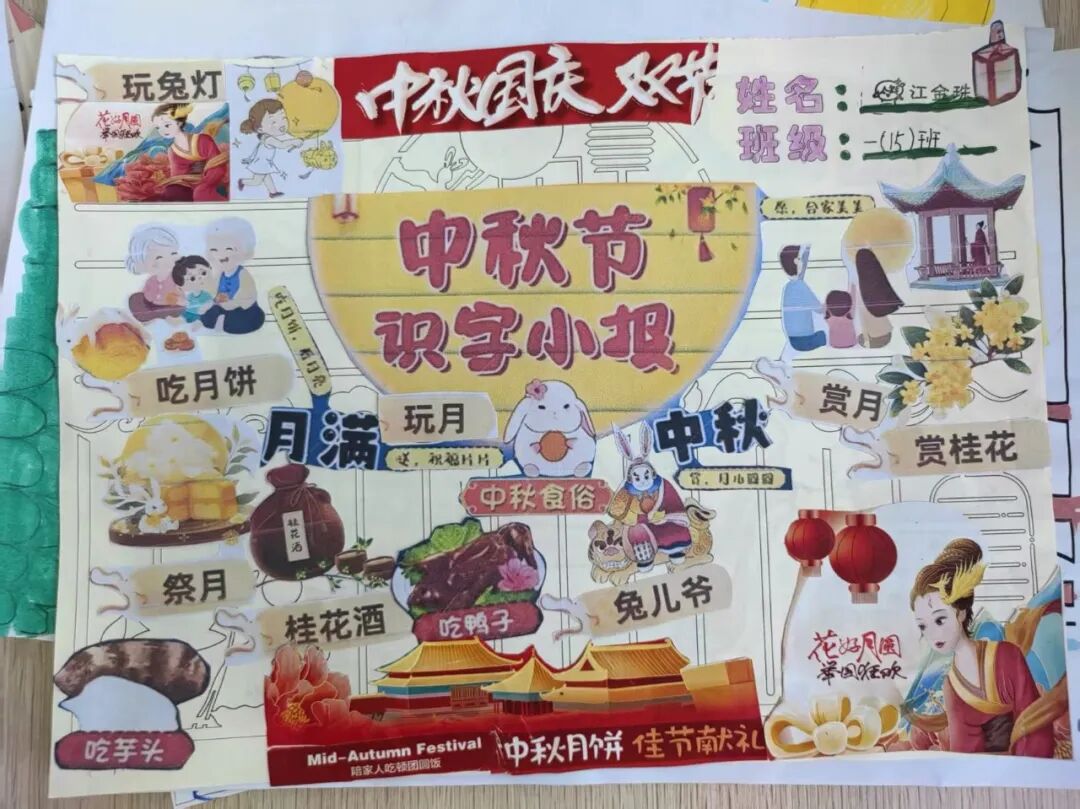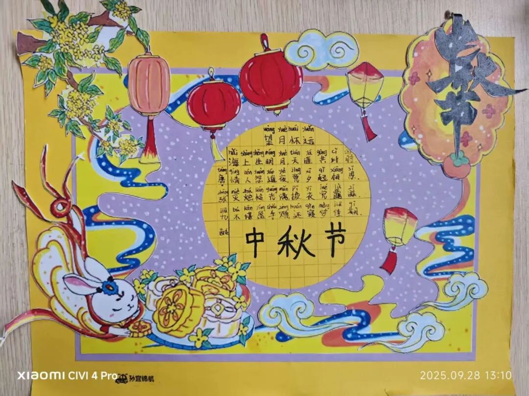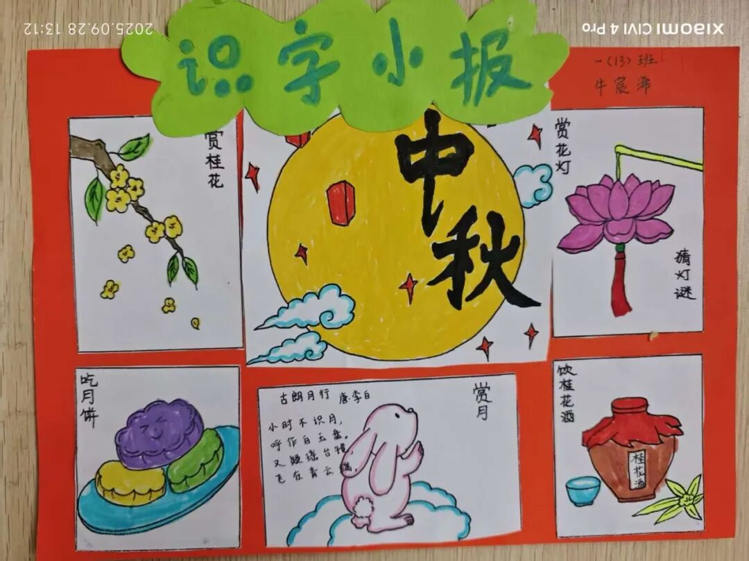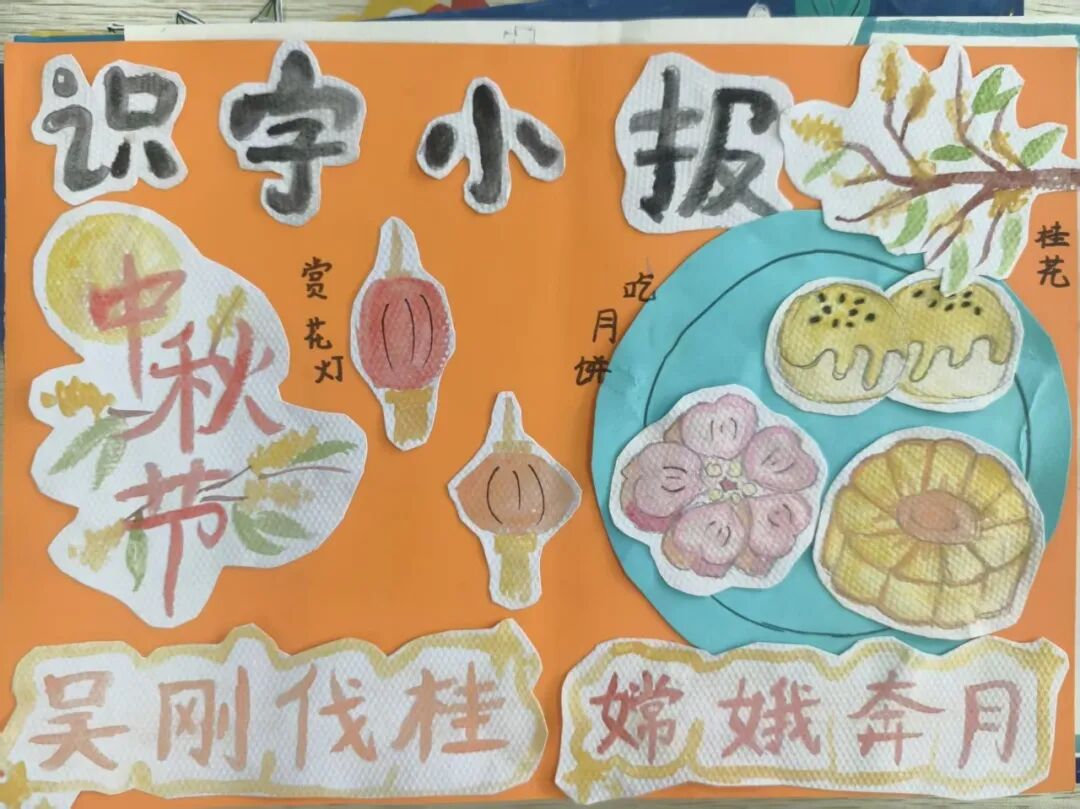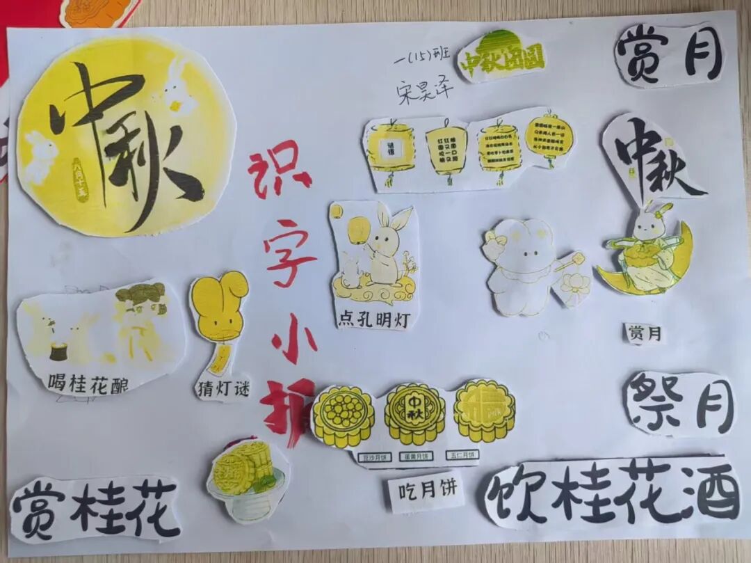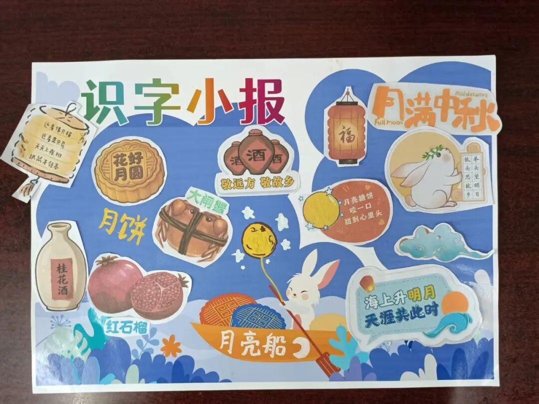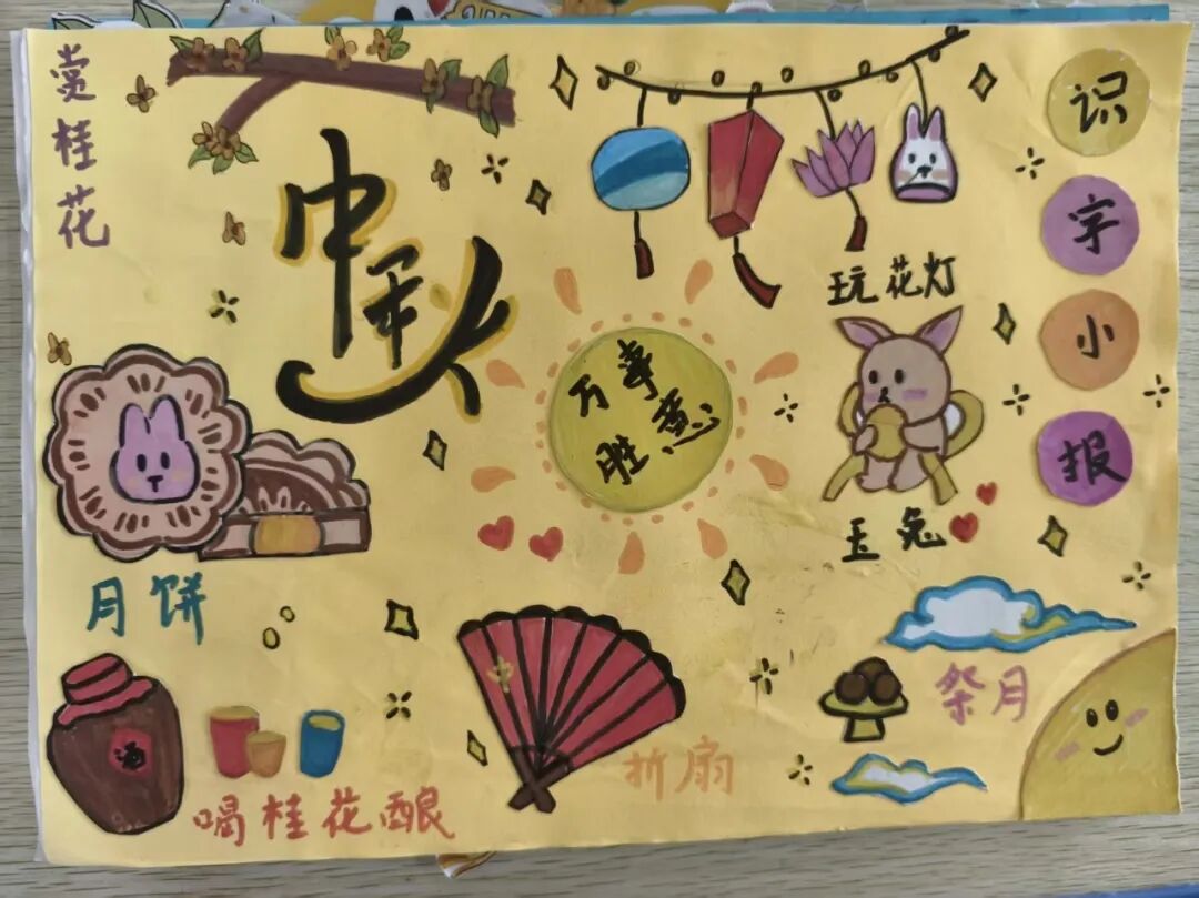 “我心中的中秋月,是挂在彩虹上的!”“我的中秋月里,有小兔子和桂花树!”在“勾勒中秋月”环节,孩子们拿起马克笔,在A4纸上尽情挥洒创意。色彩鲜明的画作里,藏着他们对中秋最纯真的想象;而在识字小报制作中,孩子们剪贴生活里与“中秋”相关的字词,既锻炼了动手能力,又加深了对节日的认知。