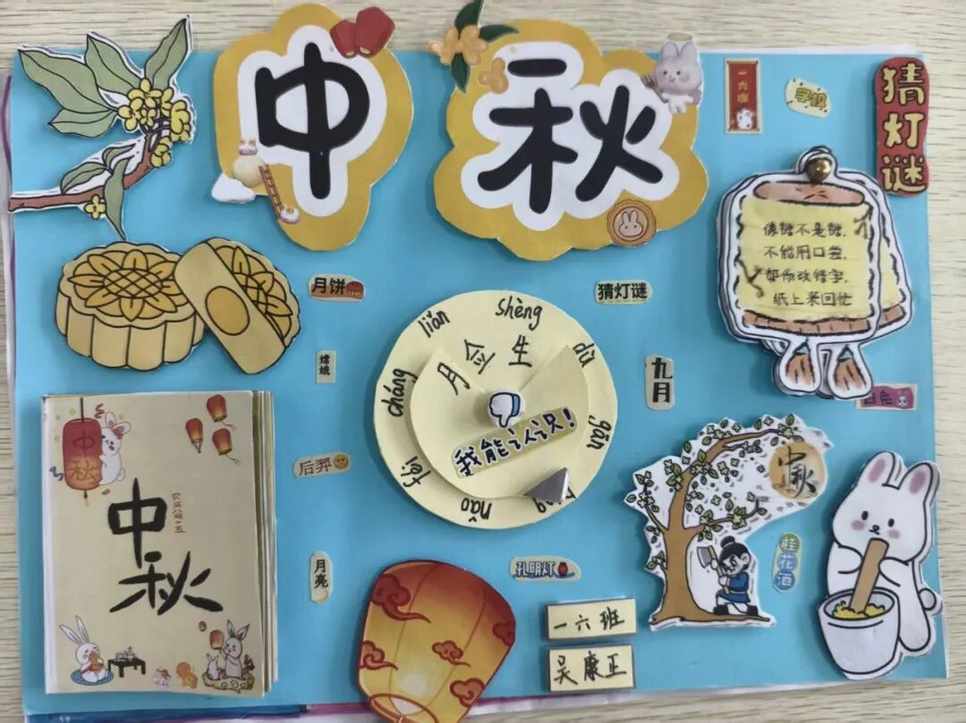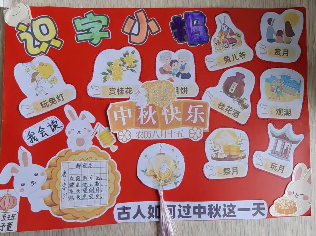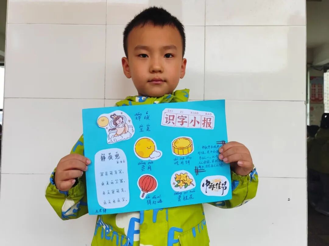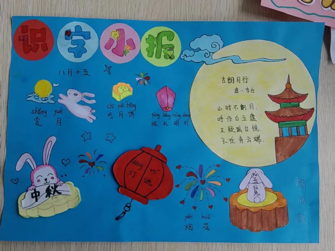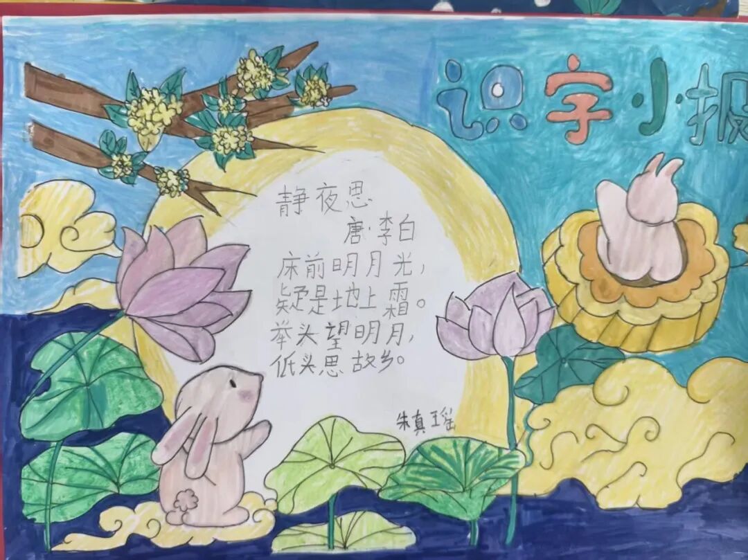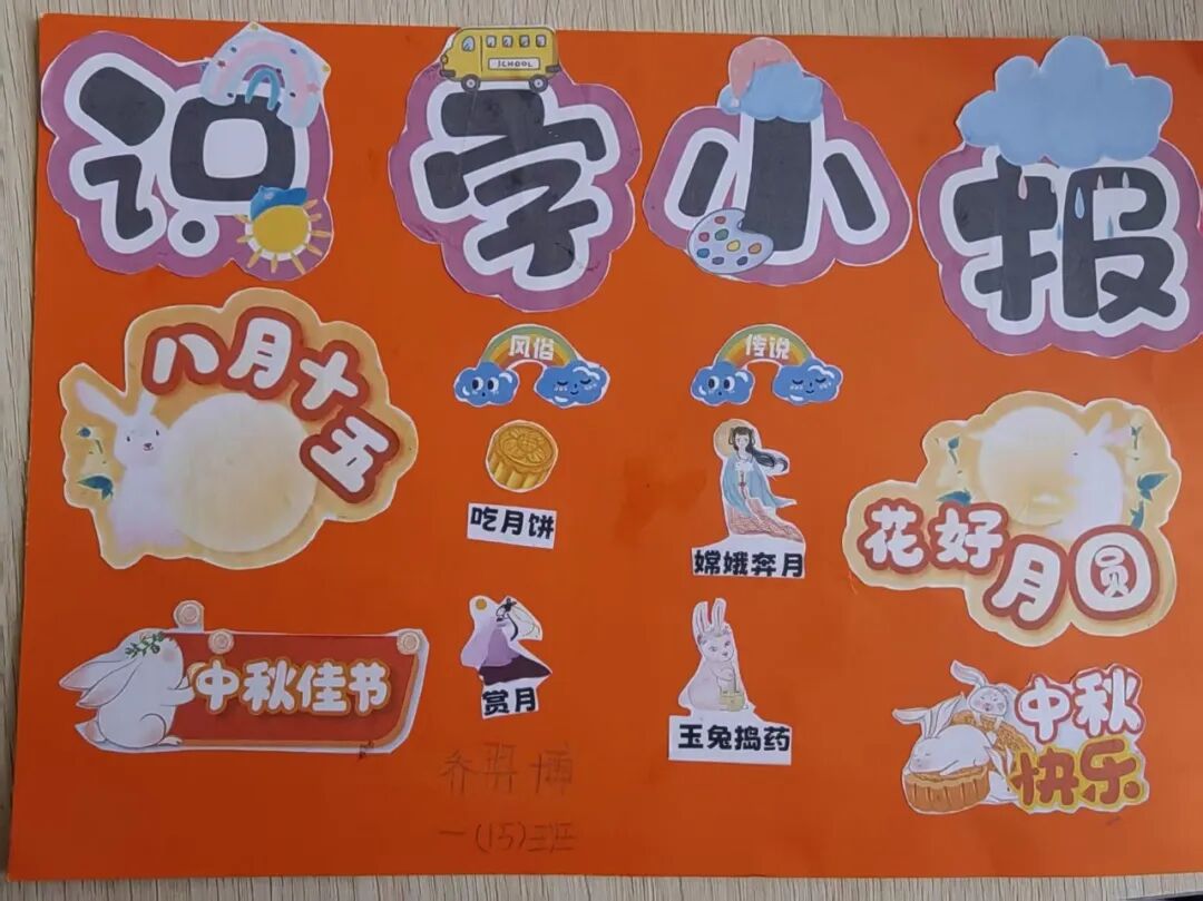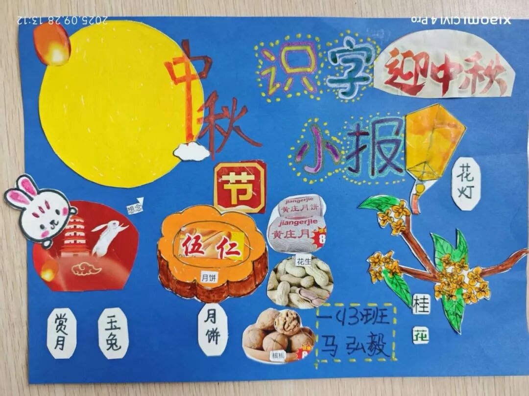“我心中的中秋月,是挂在彩虹上的!”“我的中秋月里,有小兔子和桂花树!”在“勾勒中秋月”环节,孩子们拿起马克笔,在A4纸上尽情挥洒创意。色彩鲜明的画作里,藏着他们对中秋最纯真的想象;而在识字小报制作中,孩子们剪贴生活里与“中秋”相关的字词,既锻炼了动手能力,又加深了对节日的认知。