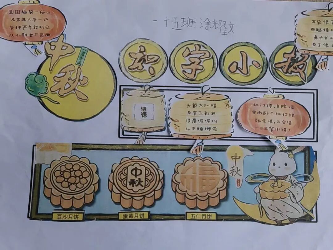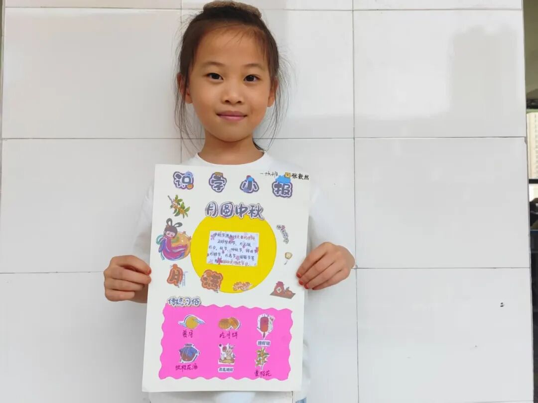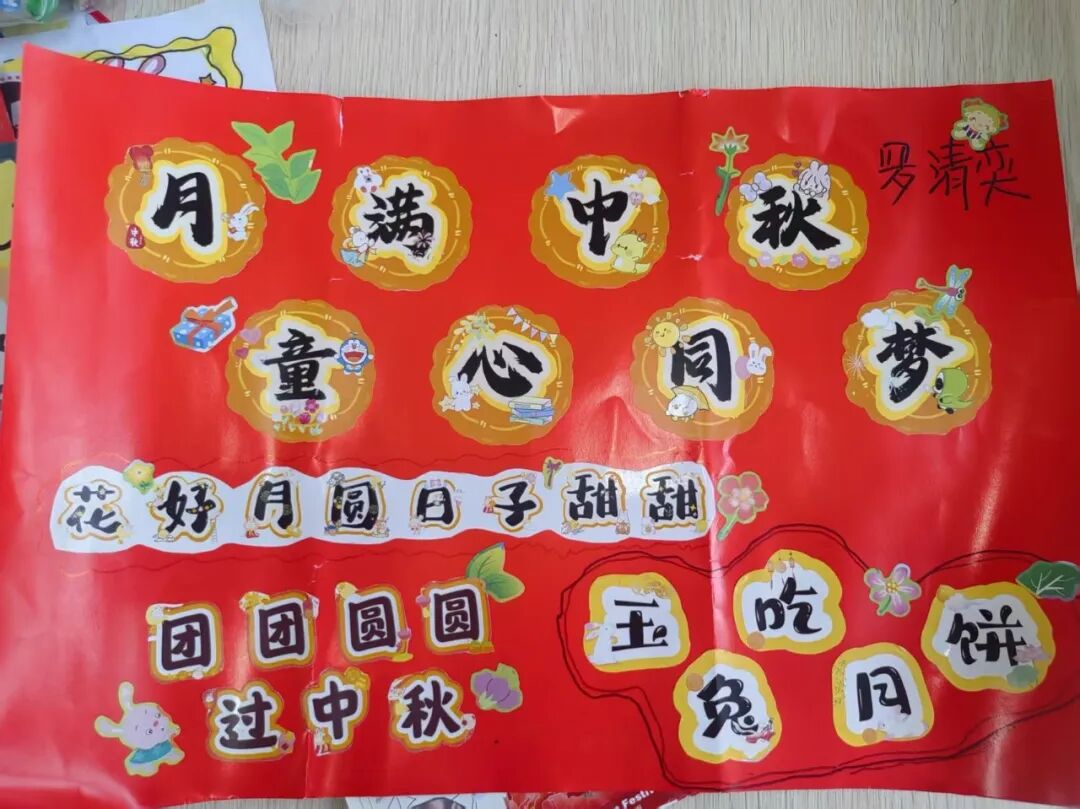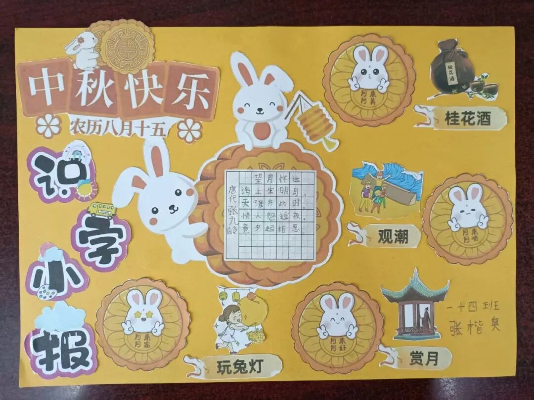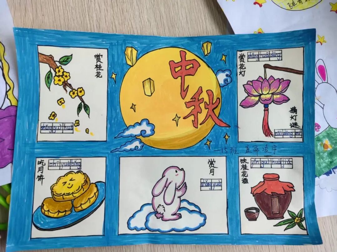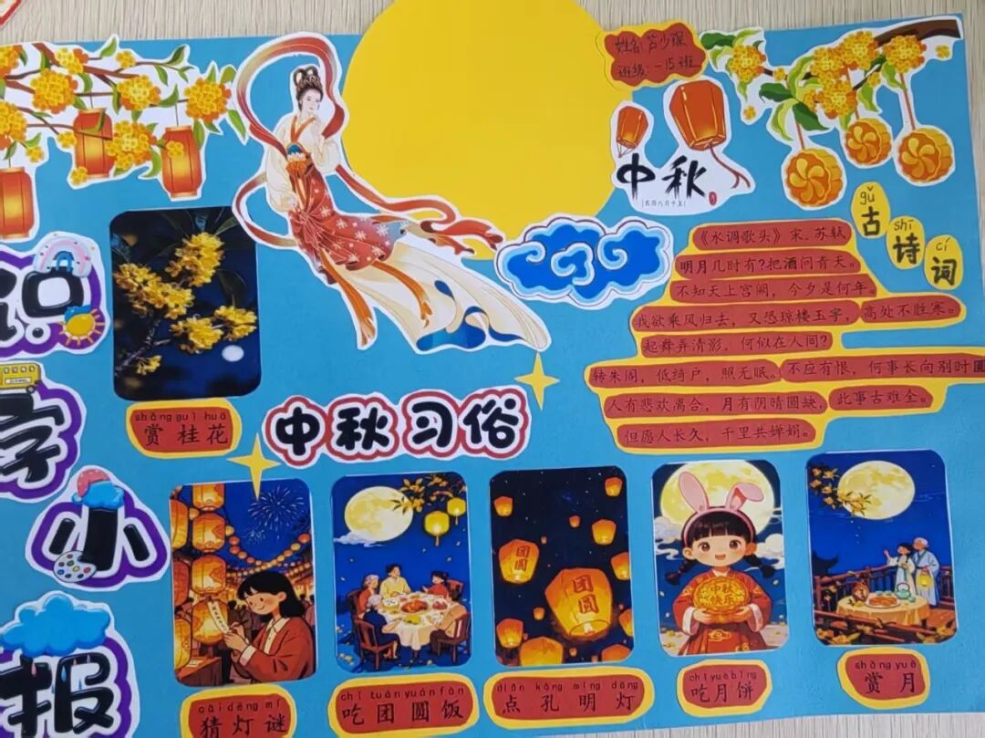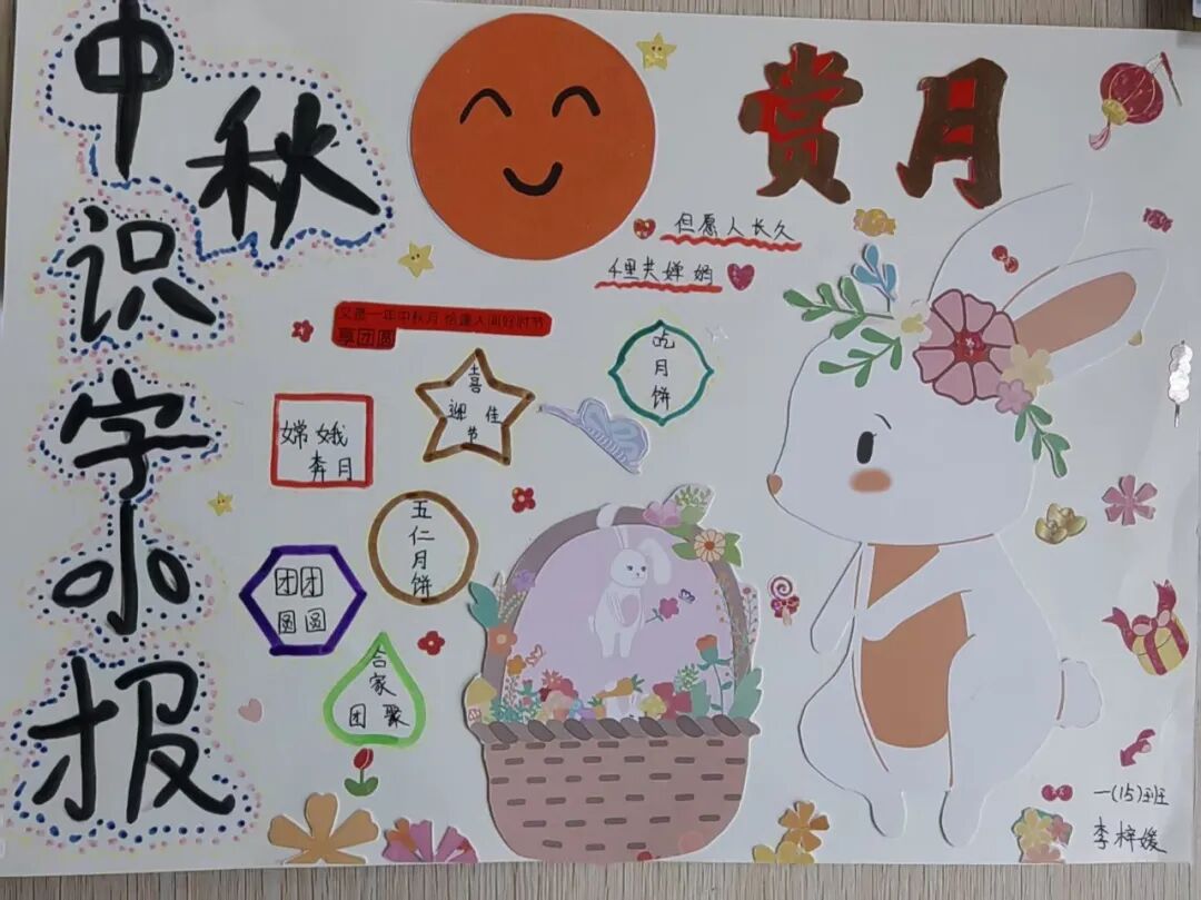 “我心中的中秋月,是挂在彩虹上的!”“我的中秋月里,有小兔子和桂花树!”在“勾勒中秋月”环节,孩子们拿起马克笔,在A4纸上尽情挥洒创意。色彩鲜明的画作里,藏着他们对中秋最纯真的想象;而在识字小报制作中,孩子们剪贴生活里与“中秋”相关的字词,既锻炼了动手能力,又加深了对节日的认知。