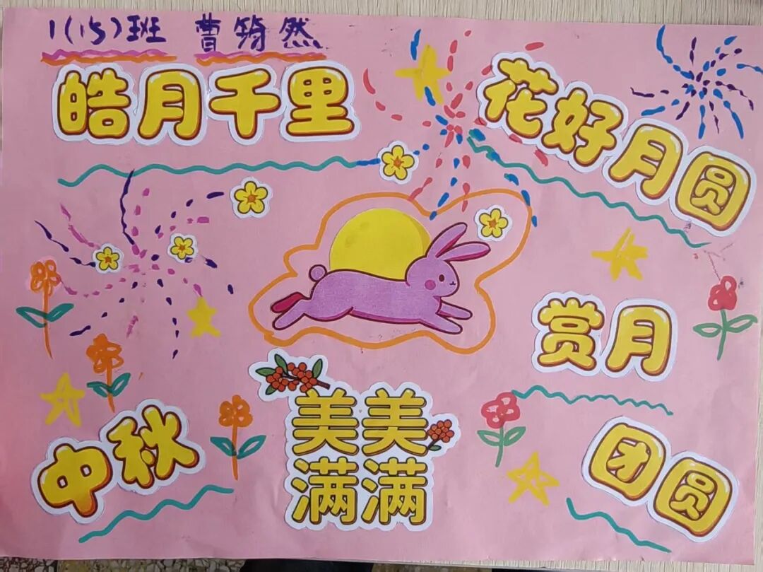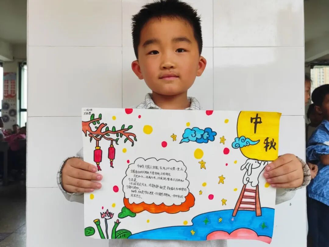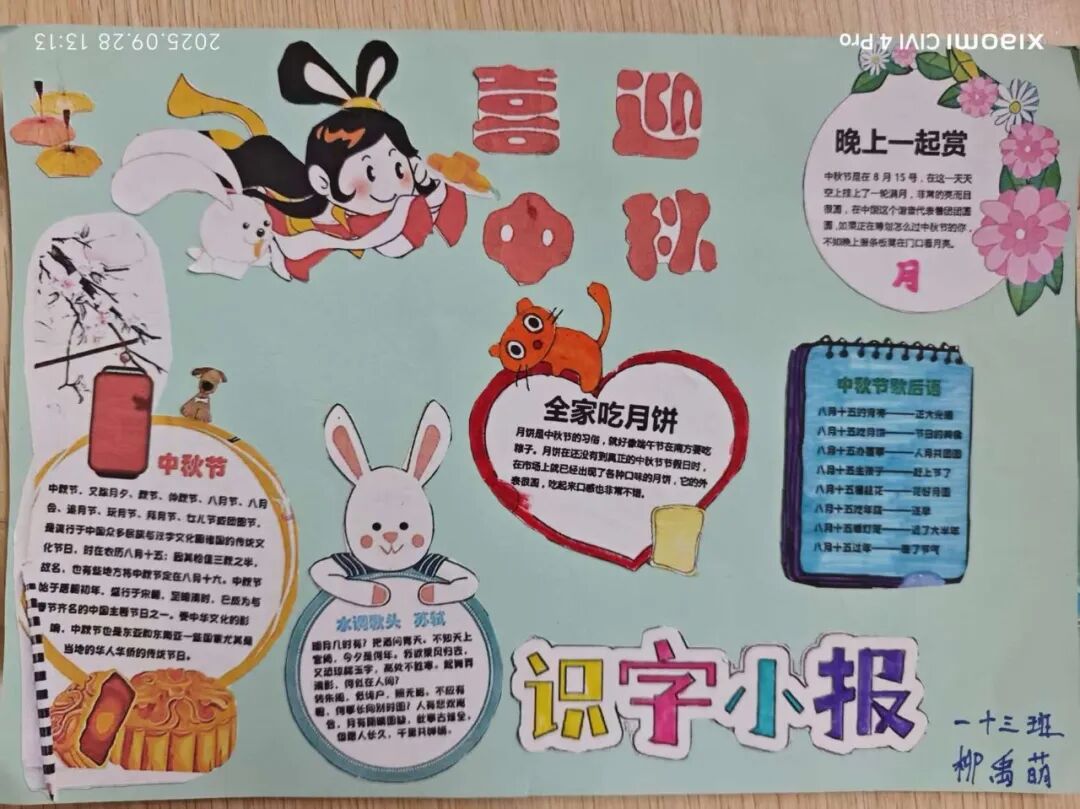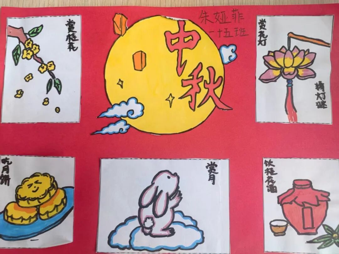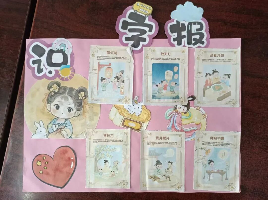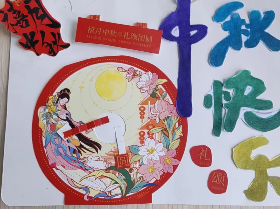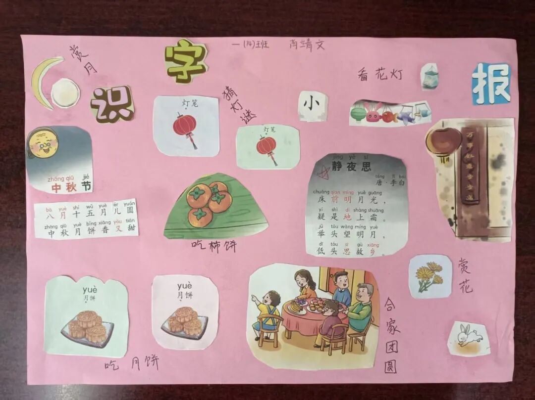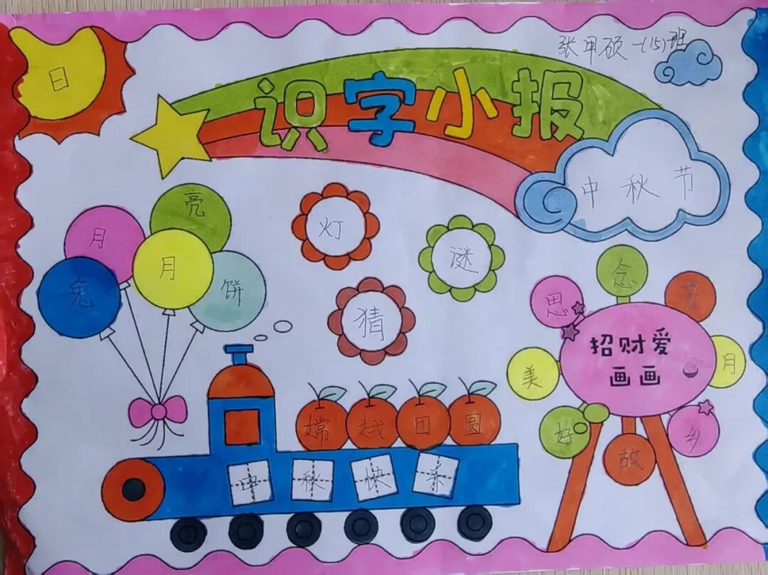 “我心中的中秋月,是挂在彩虹上的!”“我的中秋月里,有小兔子和桂花树!”在“勾勒中秋月”环节,孩子们拿起马克笔,在A4纸上尽情挥洒创意。色彩鲜明的画作里,藏着他们对中秋最纯真的想象;而在识字小报制作中,孩子们剪贴生活里与“中秋”相关的字词,既锻炼了动手能力,又加深了对节日的认知。