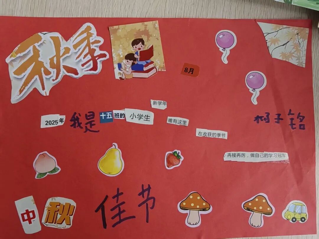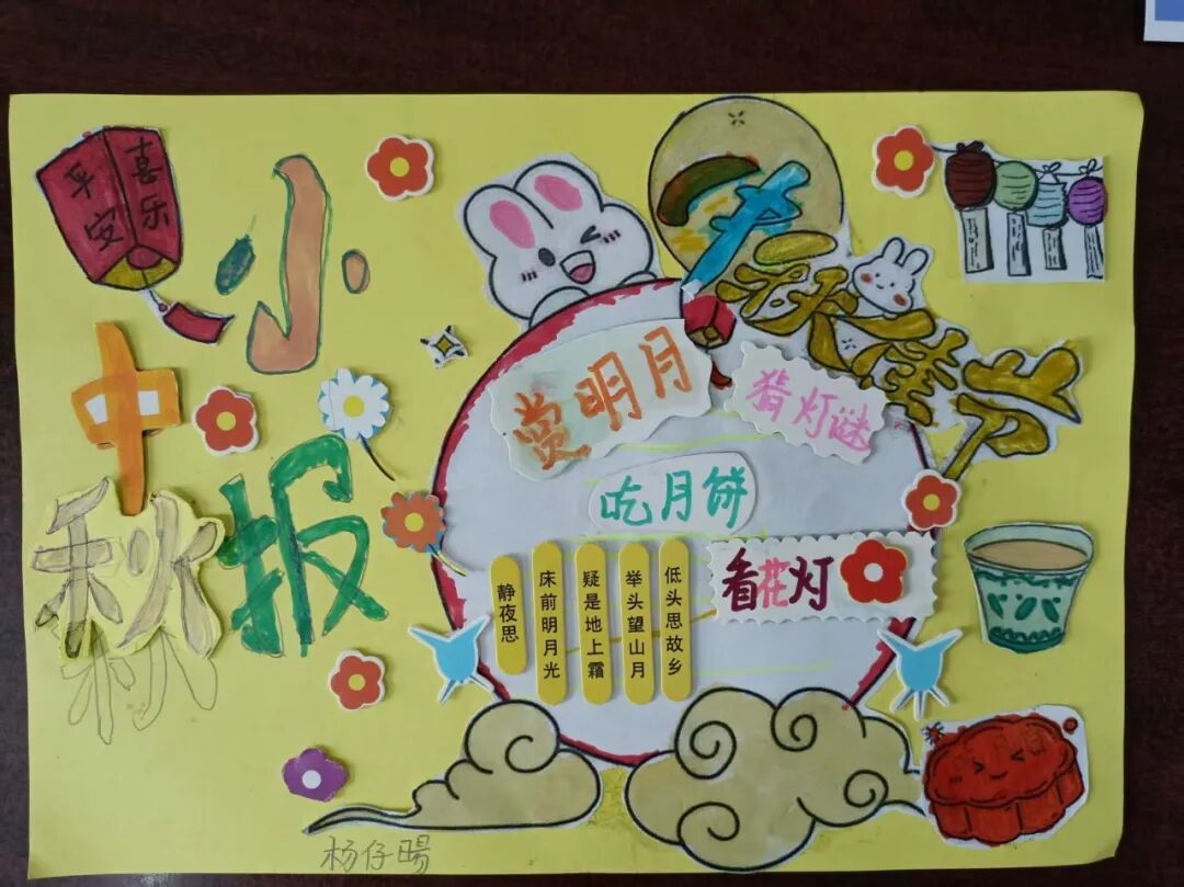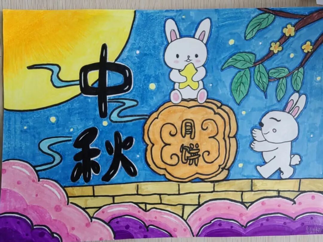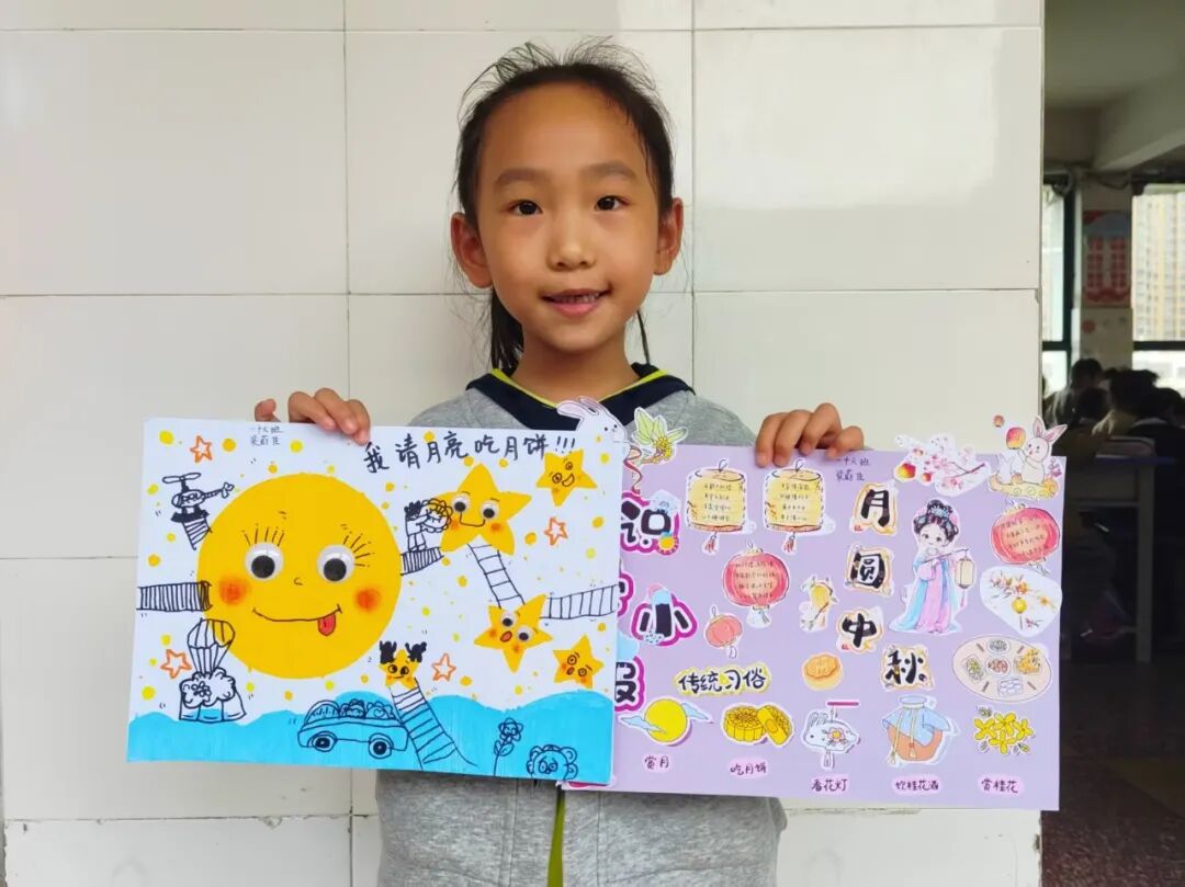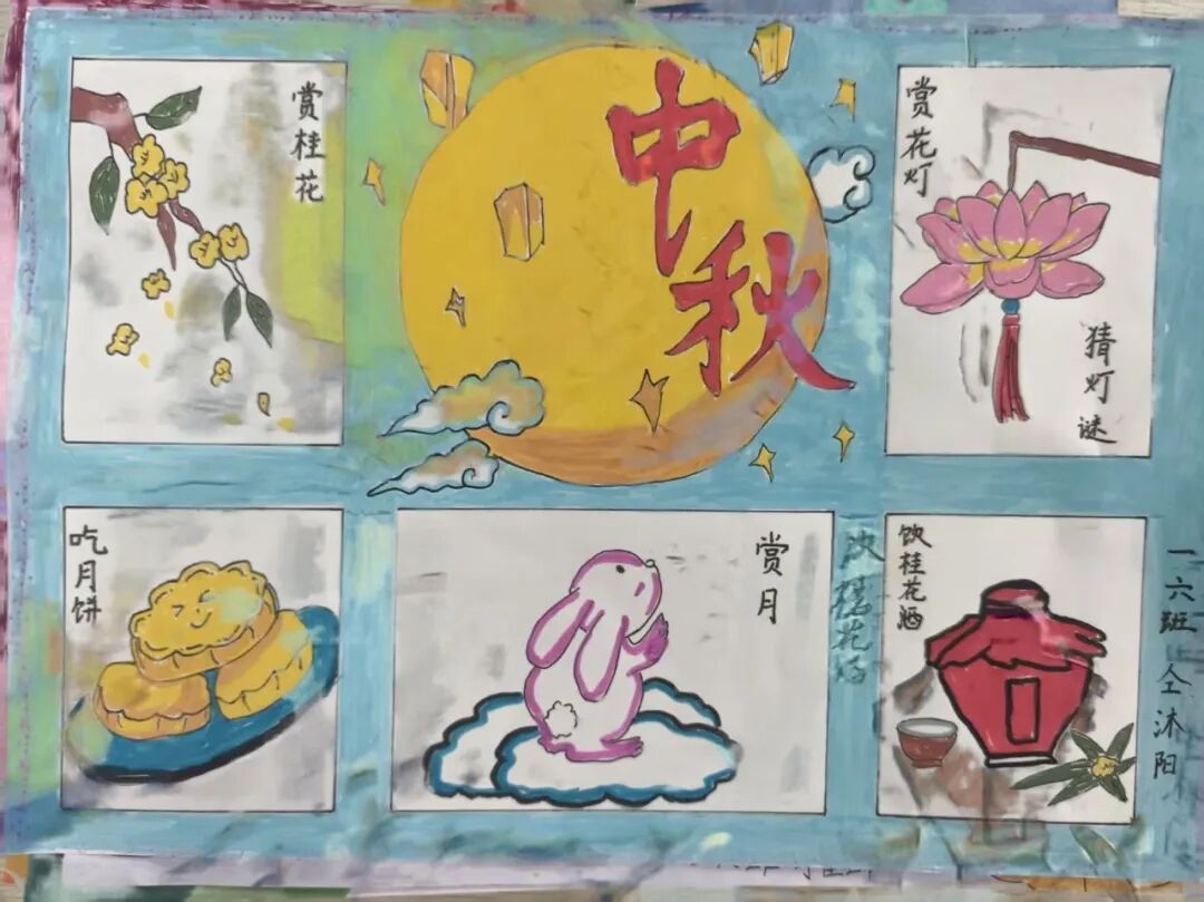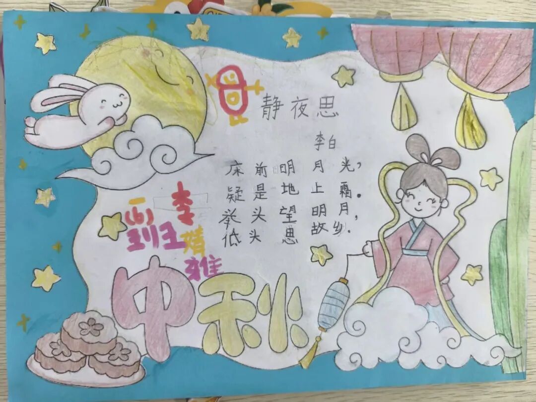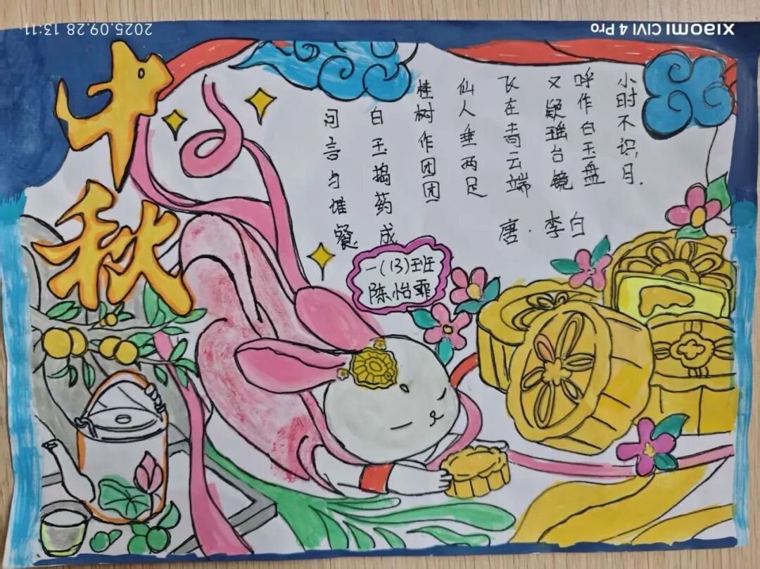 “我心中的中秋月,是挂在彩虹上的!”“我的中秋月里,有小兔子和桂花树!”在“勾勒中秋月”环节,孩子们拿起马克笔,在A4纸上尽情挥洒创意。色彩鲜明的画作里,藏着他们对中秋最纯真的想象;而在识字小报制作中,孩子们剪贴生活里与“中秋”相关的字词,既锻炼了动手能力,又加深了对节日的认知。
