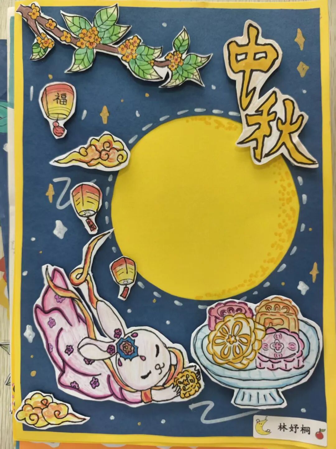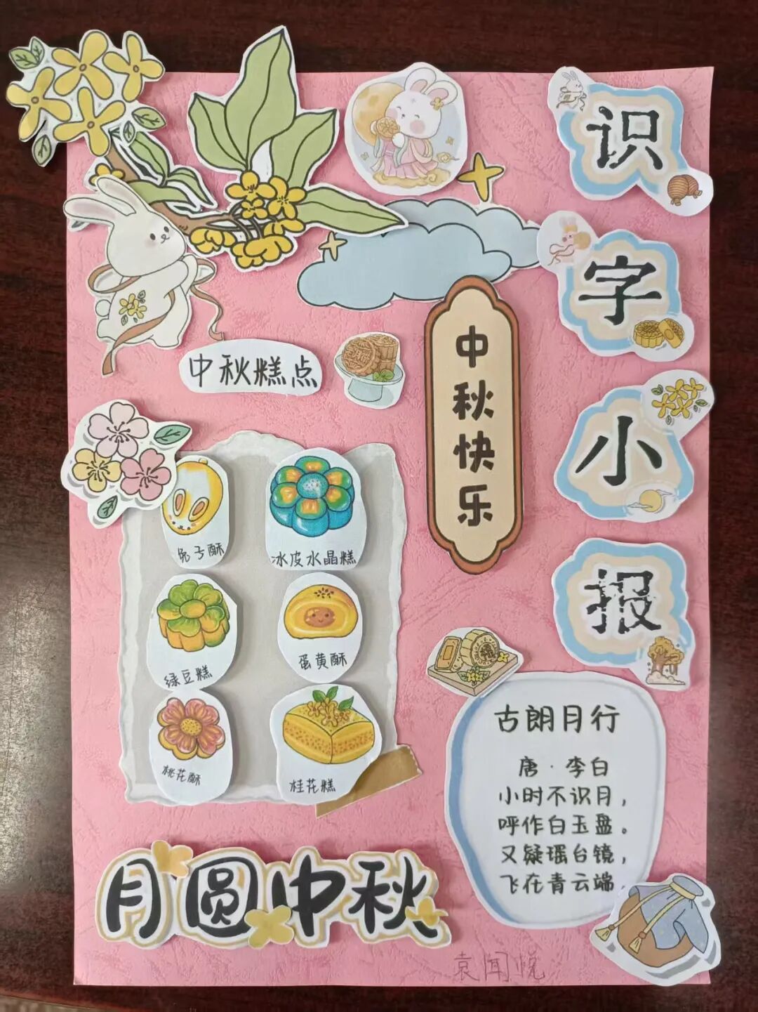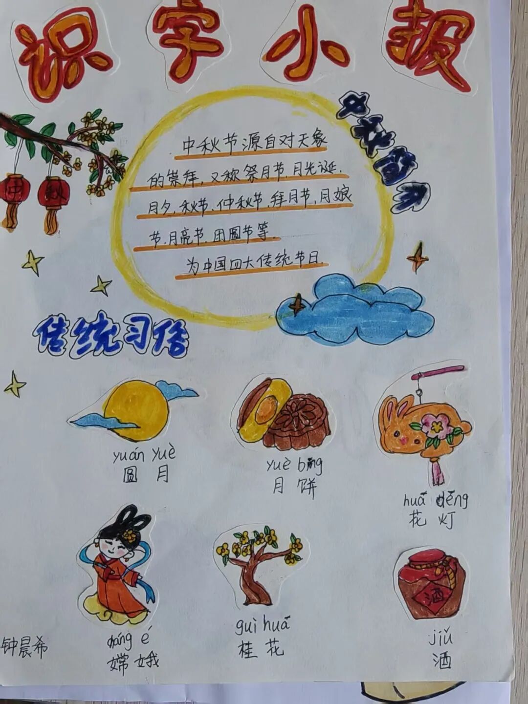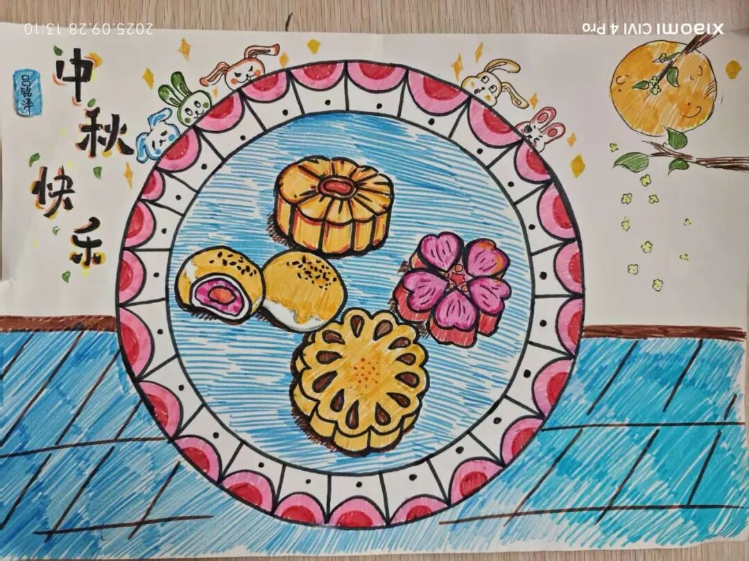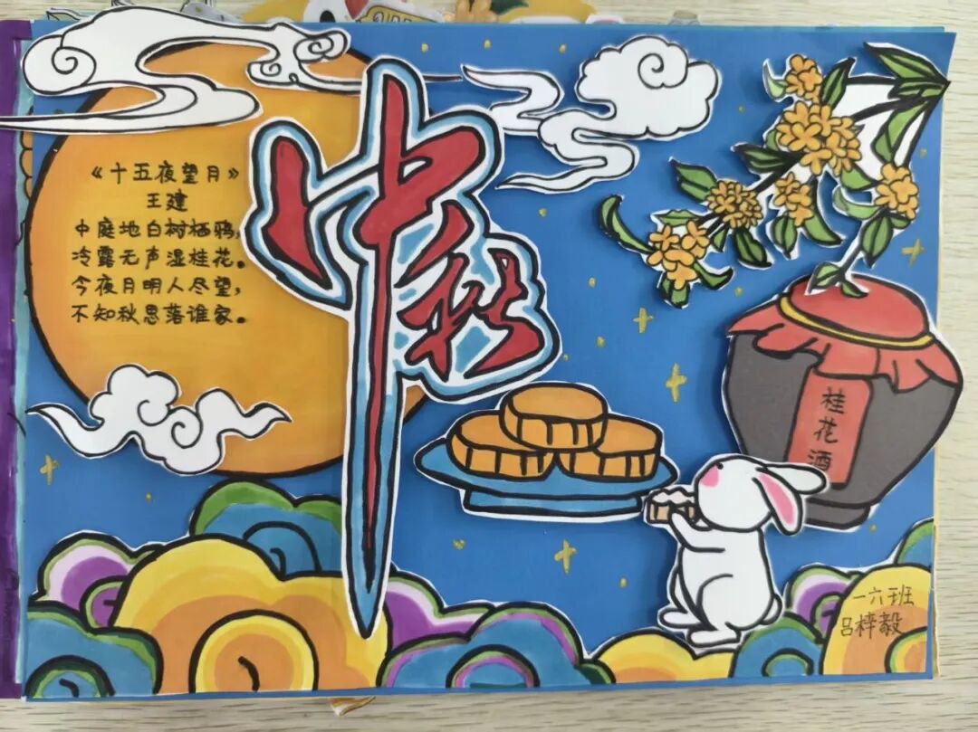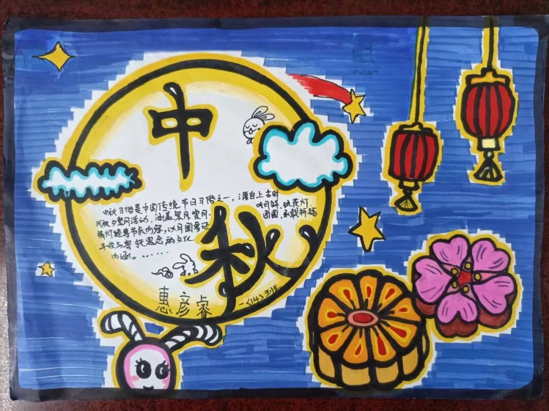 “我心中的中秋月,是挂在彩虹上的!”“我的中秋月里,有小兔子和桂花树!”在“勾勒中秋月”环节,孩子们拿起马克笔,在A4纸上尽情挥洒创意。色彩鲜明的画作里,藏着他们对中秋最纯真的想象;而在识字小报制作中,孩子们剪贴生活里与“中秋”相关的字词,既锻炼了动手能力,又加深了对节日的认知。