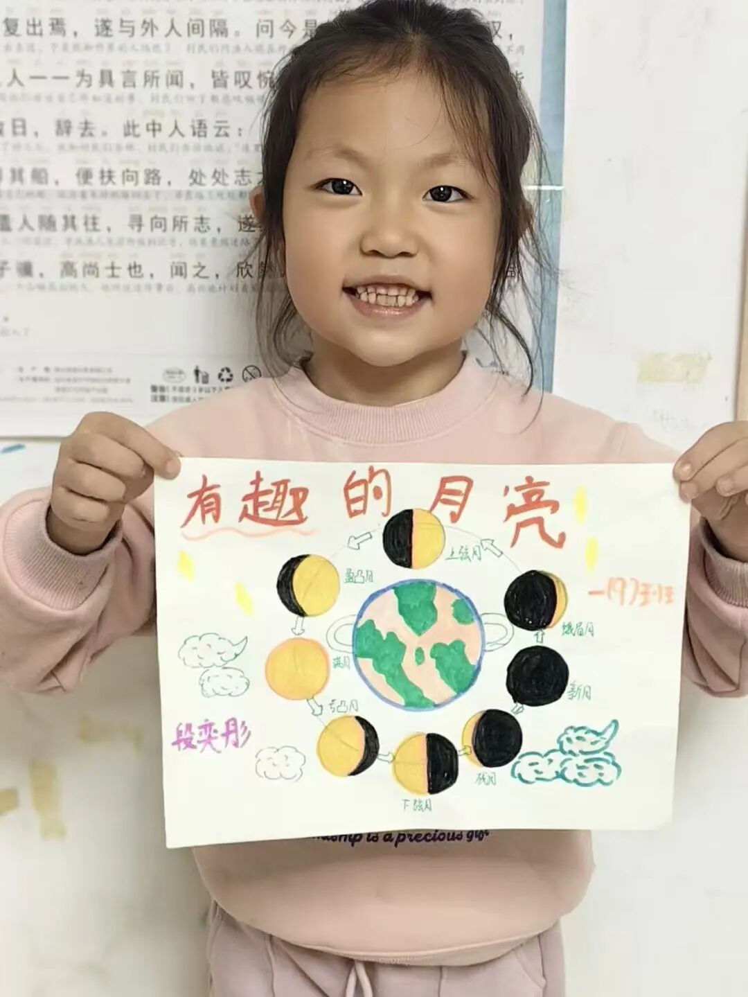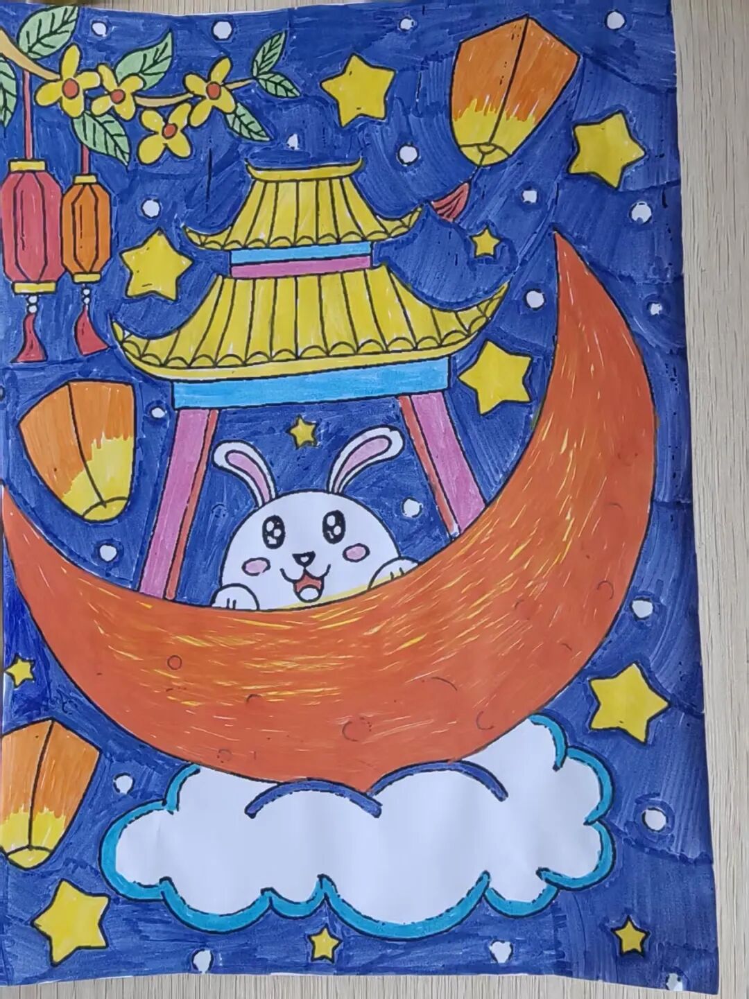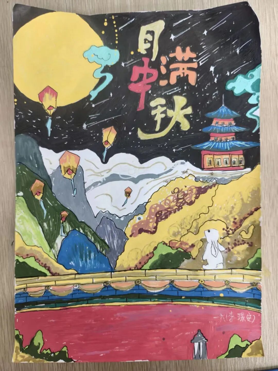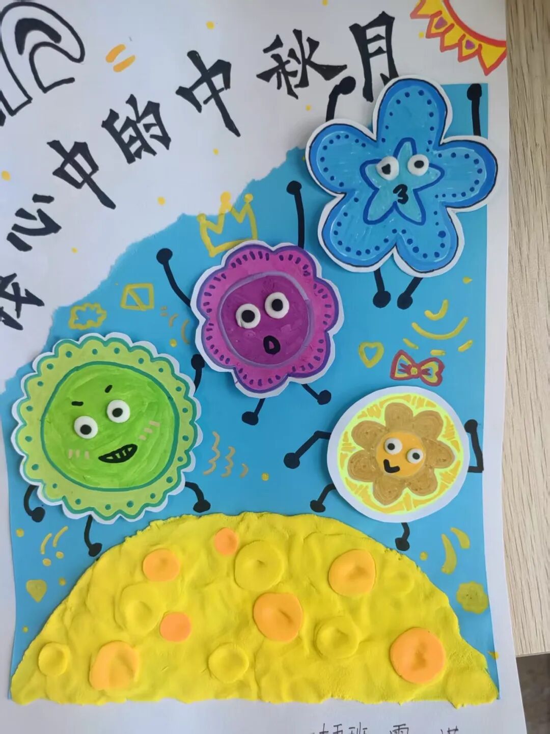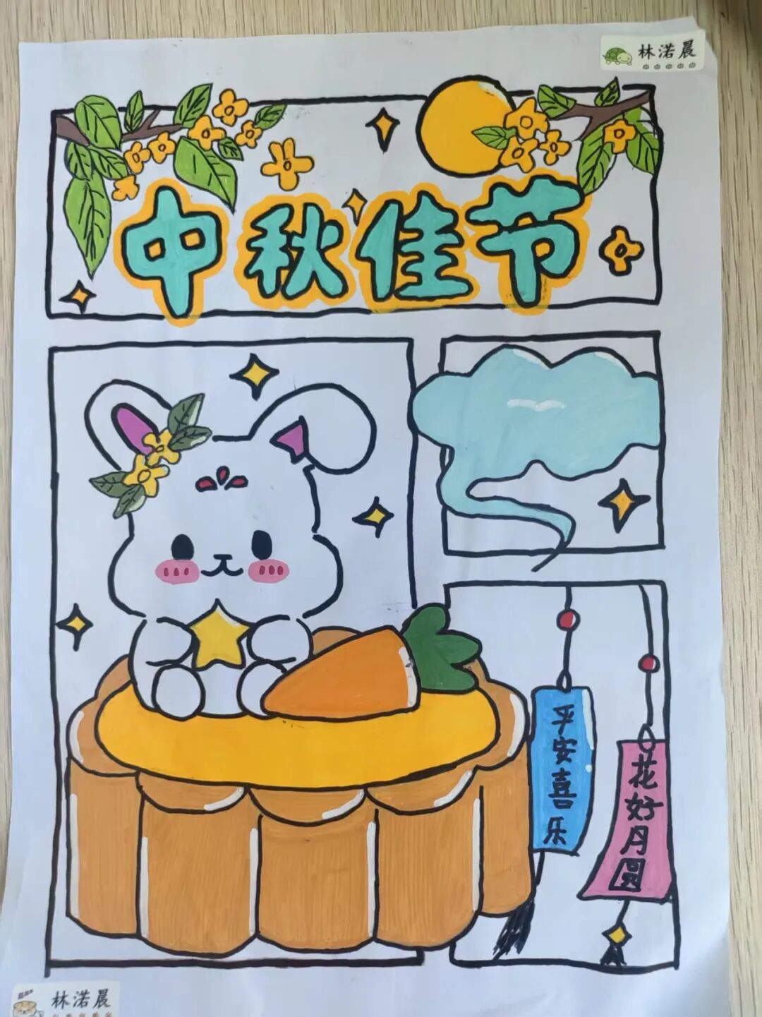 “我心中的中秋月,是挂在彩虹上的!”“我的中秋月里,有小兔子和桂花树!”在“勾勒中秋月”环节,孩子们拿起马克笔,在A4纸上尽情挥洒创意。色彩鲜明的画作里,藏着他们对中秋最纯真的想象;而在识字小报制作中,孩子们剪贴生活里与“中秋”相关的字词,既锻炼了动手能力,又加深了对节日的认知。